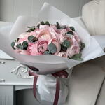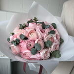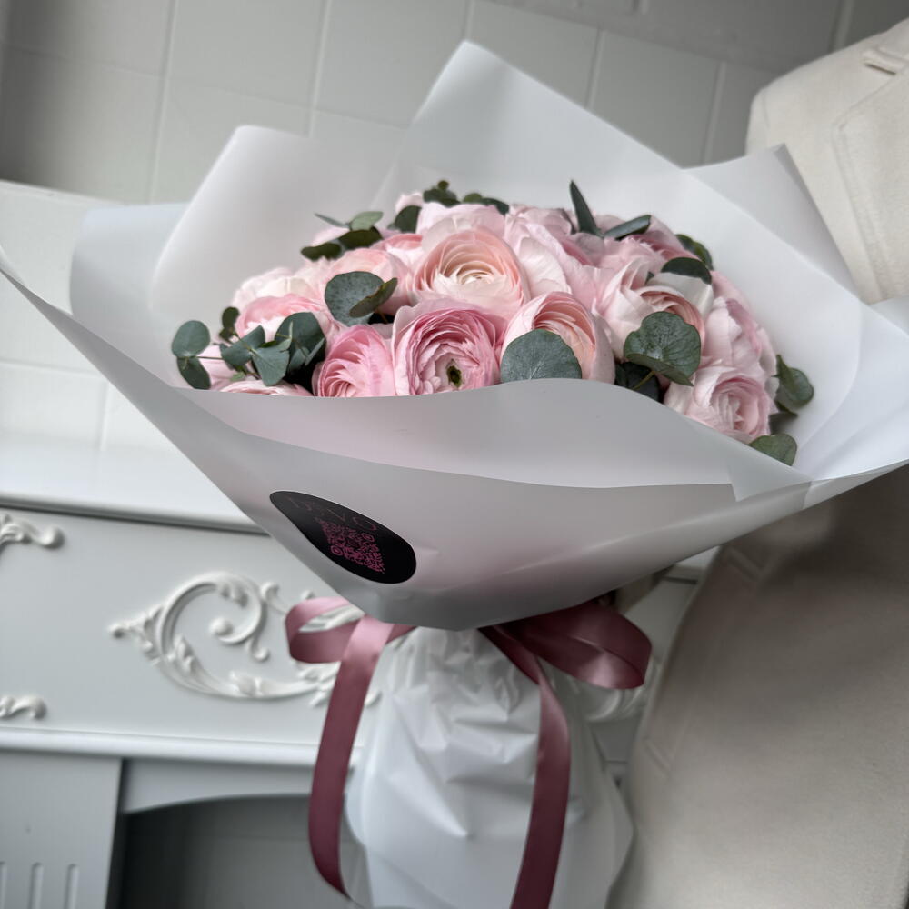 A bouquet of soft pink Italian ranunculus highlighted by elegant packaging made of high-quality white floral film with a satin bow. Despite its tenderness, ranunculus is a very persistent flower and will delight you for about two weeks.