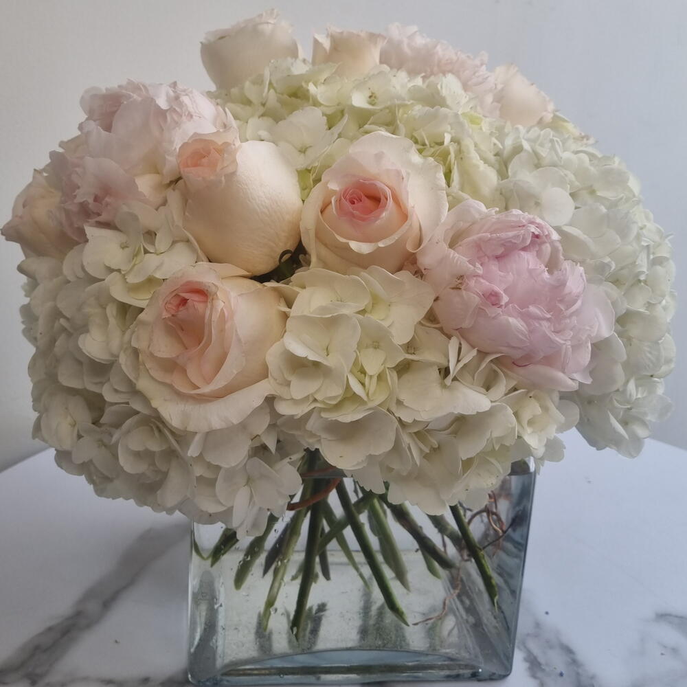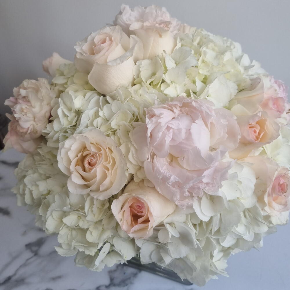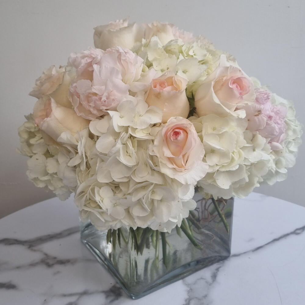 Ivory Cloud is an elegant floral arrangement created in a clear glass vase. Featuring lush white hydrangeas, ivory roses, and soft blush peonies, this composition offers a timeless, airy look with refined texture and volume. Perfect for weddings, anniversaries, sympathy gestures, or sophisticated interior décor. Flower varieties may vary slightly depending on seasonal availability while maintaining the overall palette and style.