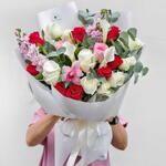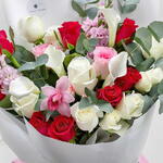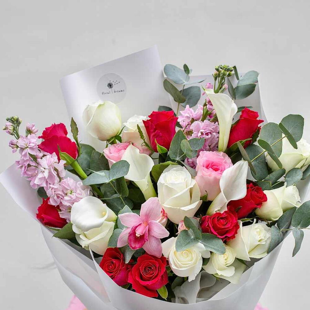 Orchid - 2 pcs white calla lilies - 6 pcs red roses - 10 pcs pink roses - 6 pcs white roses - 8 pcs