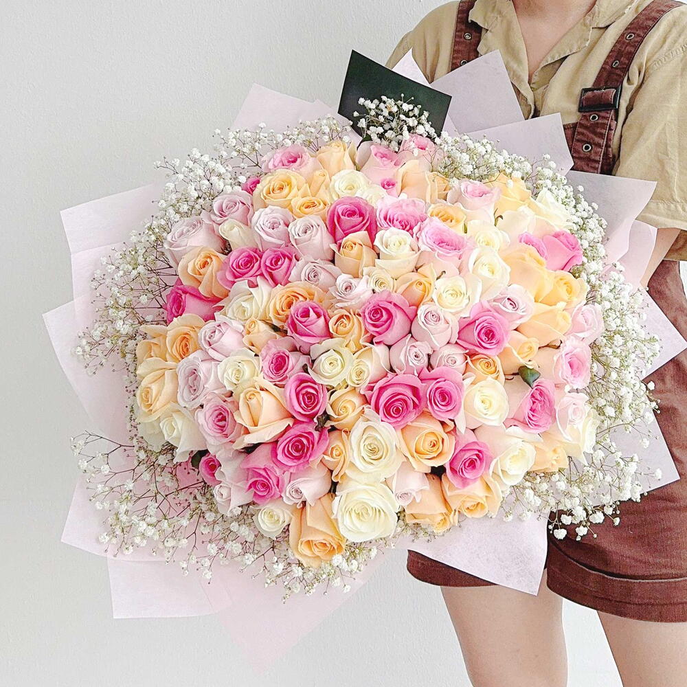 Promising your commitment to your beloved is something that you don’t only have to restrict yourself to doing on your wedding day or anniversaries. Instead, the object of your affection deserves to be reminded of your undying love ‘just because.’ With this stunning 99 Rose Bouquet, you can make a huge statement of your adoration and love. The rose is a common symbol that speaks the words ‘I will love you until the day I die’ without having to utter a sound. Golden phoenix and hypericum berries enhance the appearance of the bouquet for a romantic display. Flowers used: 99 Roses, Foliage