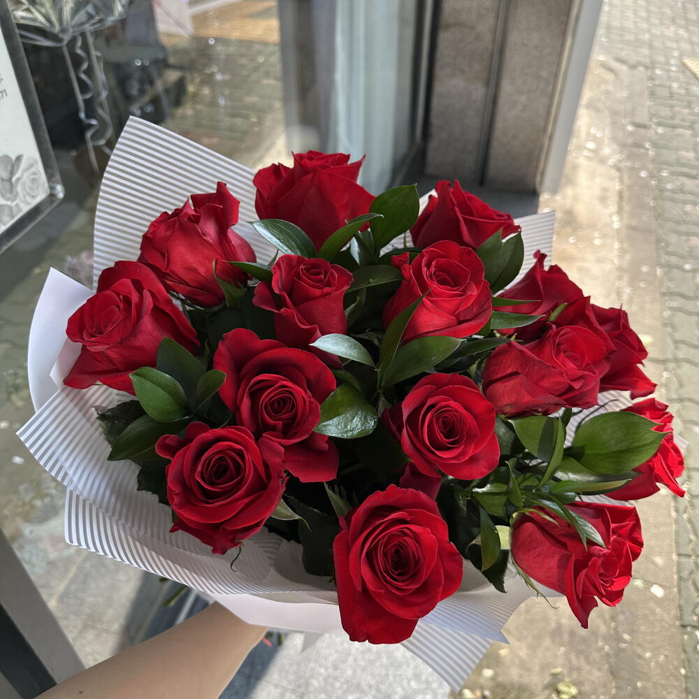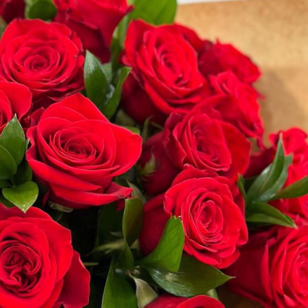 Bouquet of Colombian roses can be decorated in different variations: kraft, white pebbles, black pebbles, red tracing paper Eucalyptus or ruscus is added based on availability