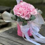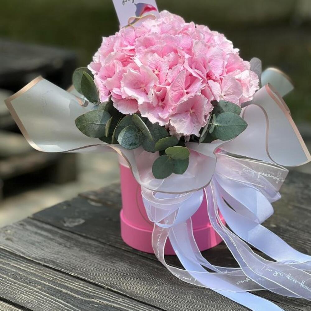 Eucalyptus - 2 pcs Oasis - 1 pcs Satin Ribbon - 3 pcs Pink hydrangea - 1 pcs Korean packaging - 1 pcs the hatbox is small - 1 pcs