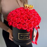 Коробка состоит из: Красная роза из мыльной пены - 61 штука Корона железная золотая - 1 штука Лента красная - 2 метра Коробка черная - 1 штука