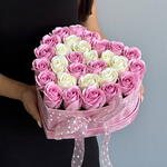 Коробка состоит из: Коробка в виде сердца розовая - 1 штука Лента розовая - 2 метра Белые Розы из мыльной пены - 10 штук Розовые розы из мыльной пены - 19 штук