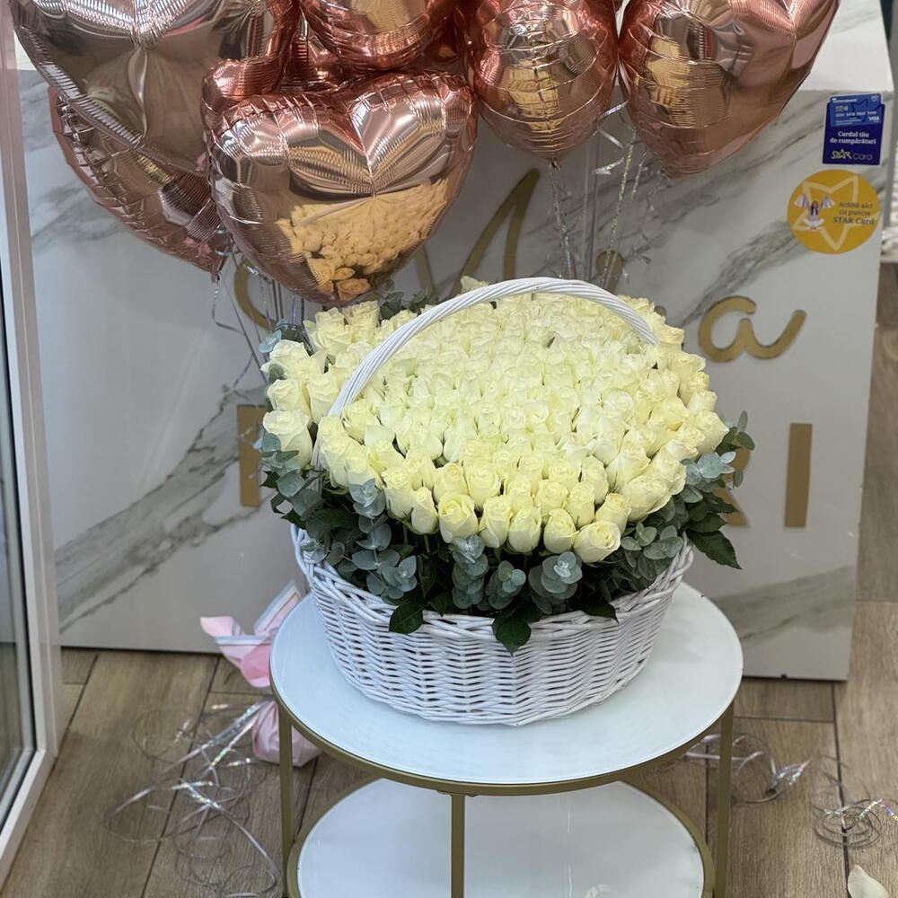 Basket - 1 pcs White rose - 151 pcs balloons heart - 21 pcs