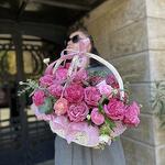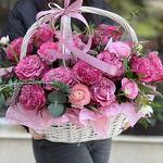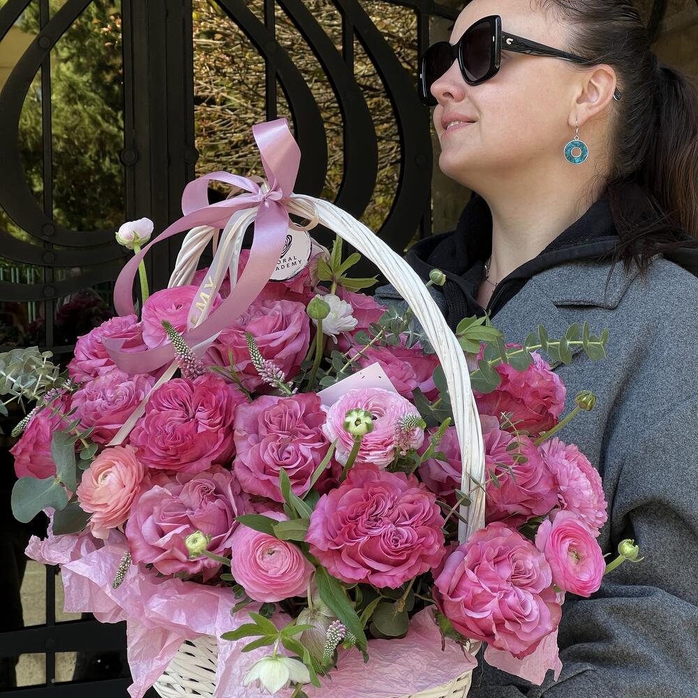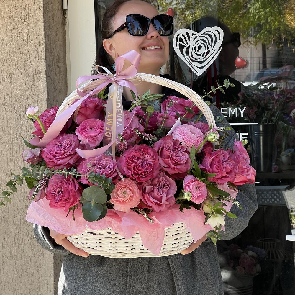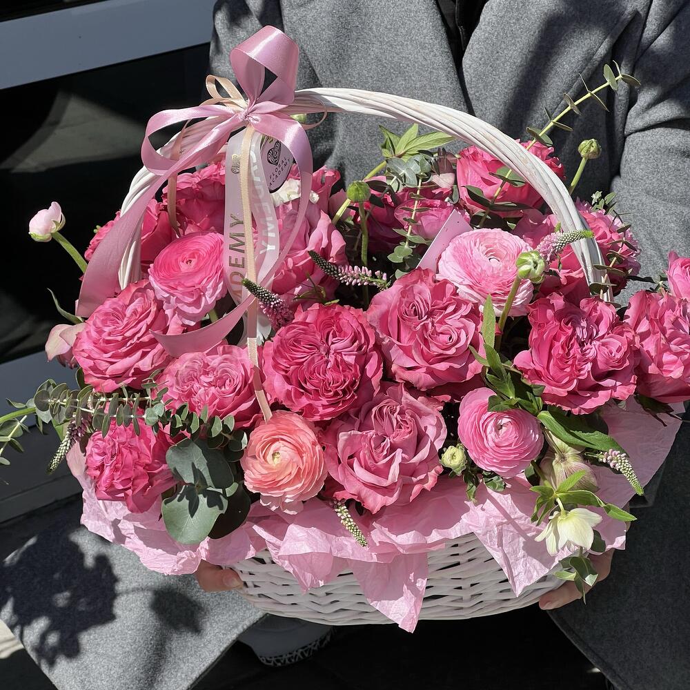 Beautiful basket of long-lasting roses and ranunculus. Convenient to use, does not require a vase