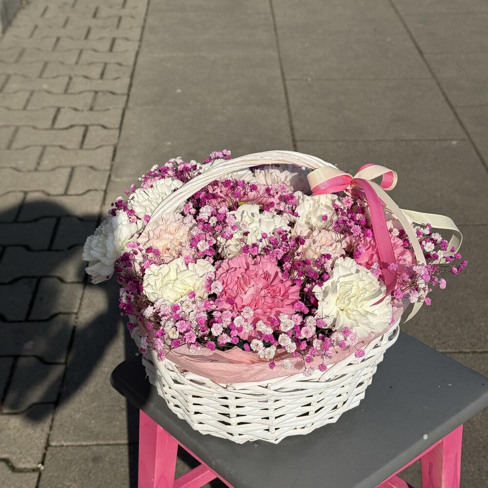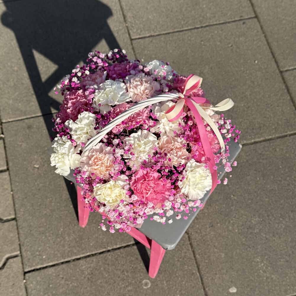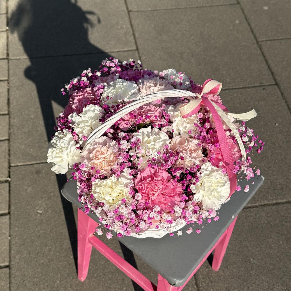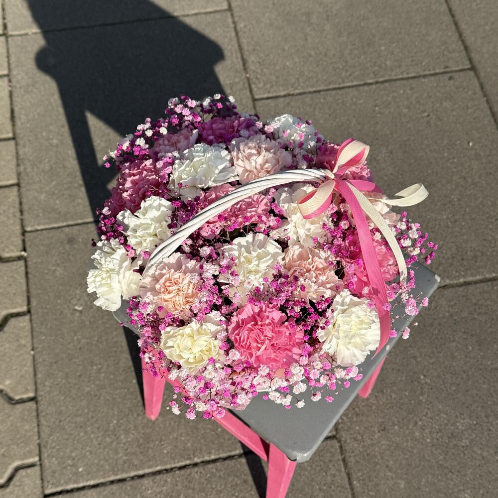 carnations - 19 pcs gypsophila - 3 pcs basket - 1 pcs floral foam - 2 pcs