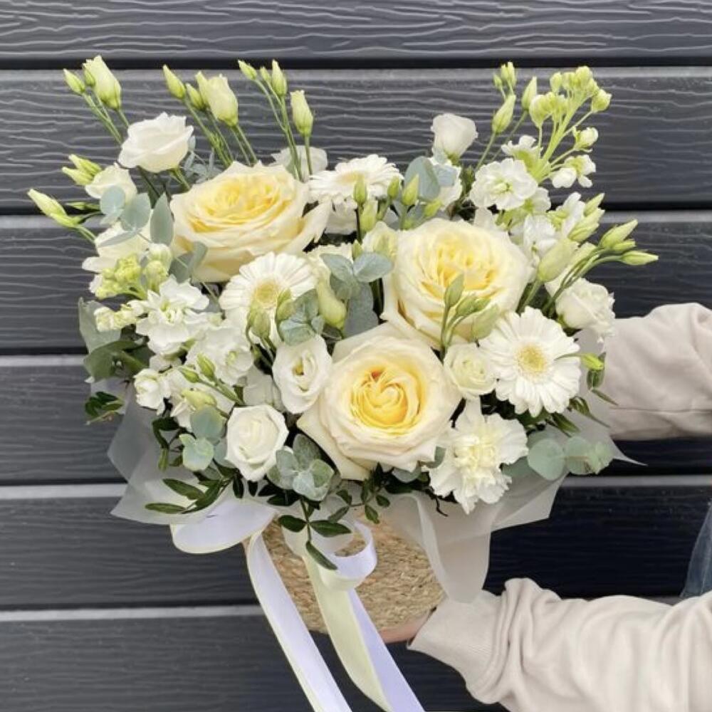 Gerbera - 7 pcs Eustoma white - 6 pcs dianthus - 4 pcs rose - 7 pcs decorative greenery - 6 pcs