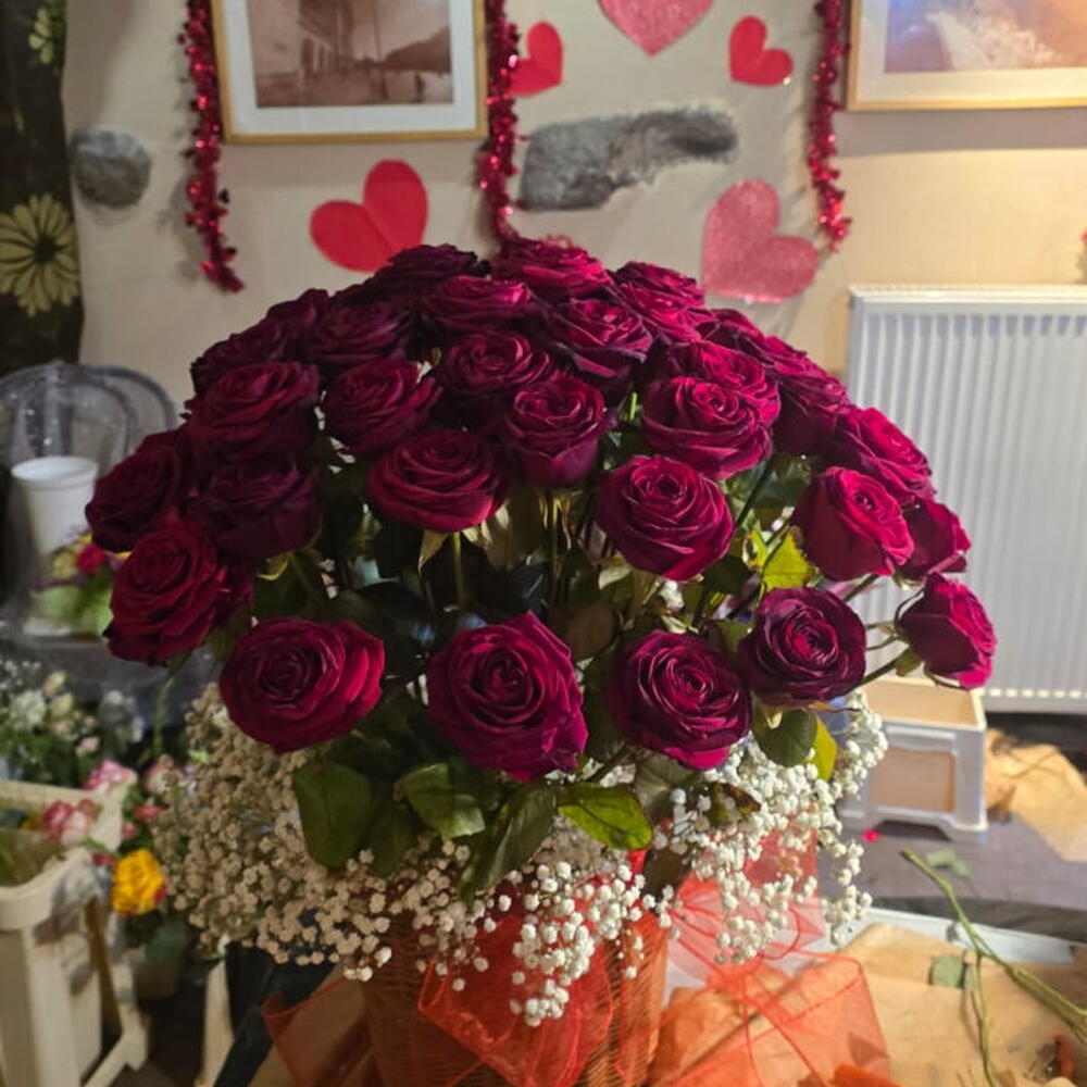 „Queen of Passion” Marketing description: A luxurious arrangement of deep burgundy roses, arranged in an elegant, compact dome shape. The deep, velvety color of the flowers symbolizes mature love, passion and elegance. Delicate baby's breath adds lightness and a subtle contrast, and sheer red organza emphasizes the romantic character of the arrangement. The whole is set in a classic basket, which adds prestige and stability to the composition. Ideal for: anniversary Valentine's Day engagement a special thank-you an elegant gift for a loved one This is a composition that makes an impression at first glance.