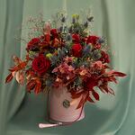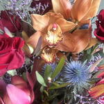 Limonium - 7 pcs eryngium - 5 pcs orchidej cymbidium - 1 pcs ruze explorer - 13 pcs photinia red leucadendron - 1 pcs