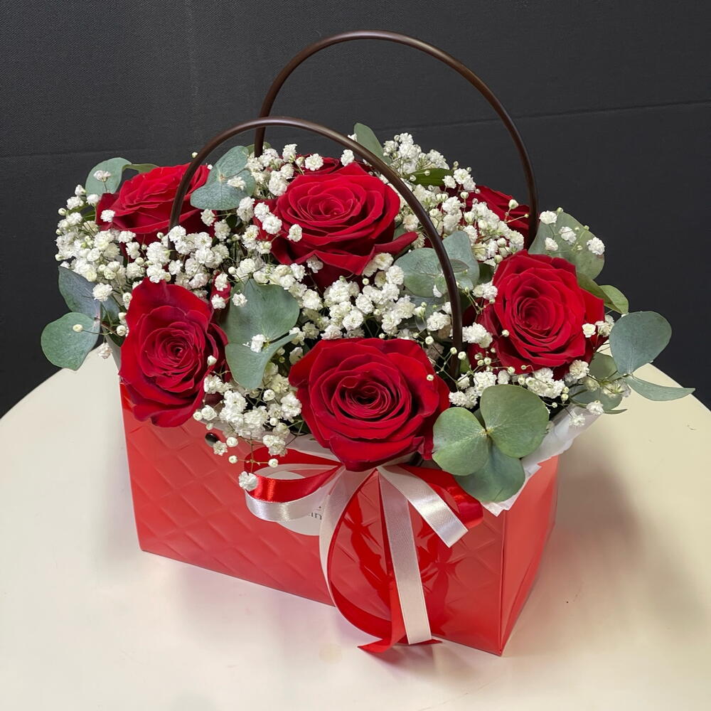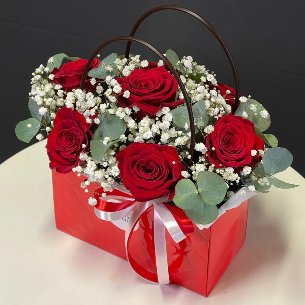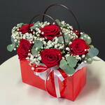Expand your expressions of love and appreciation with our elegant box of flowers. This unique assortment includes 7 outstanding rosas, known for their breathtaking beauty and longevity. Additionally, the box contains 5 eukaliptus branches, loved for their simplicity and refreshing scent. Accentuating the whole composition are 3 lovely gibsofilias, adding depth and charm to the ensemble. The box not only secures the flowers but also presents them visually captivating, making it a grand gift that will touch the heart of your loved ones.