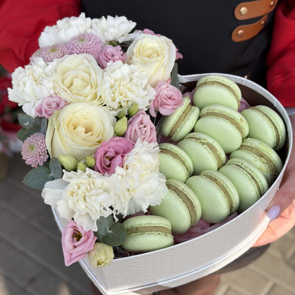 Eustoma - 2 pcs Box - 1 pcs rose - 3 pcs eucalyptus - 3 pcs carnation - 6 pcs macarons pistachio raspberry - 10 pcs