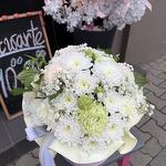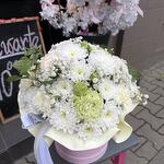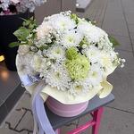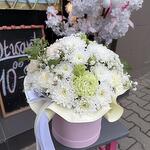 Eustoma - 2 pcs Clematis - 2 pcs carnation - 8 pcs daisy - 5 pcs box - 1 pcs gypsophila - 1 pcs floral foam - 1 pcs