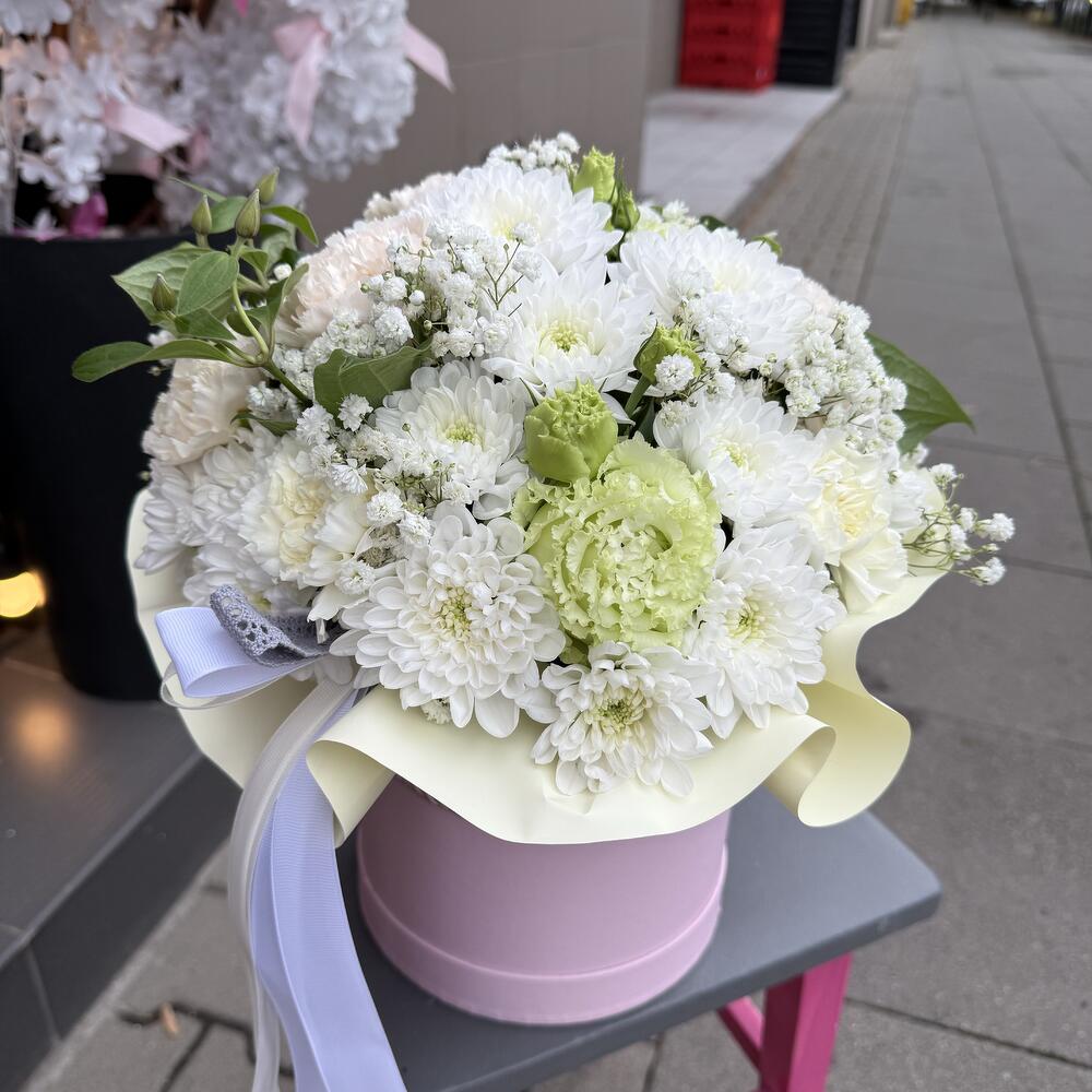 Eustoma - 2 pcs Clematis - 2 pcs carnation - 8 pcs daisy - 5 pcs box - 1 pcs gypsophila - 1 pcs floral foam - 1 pcs
