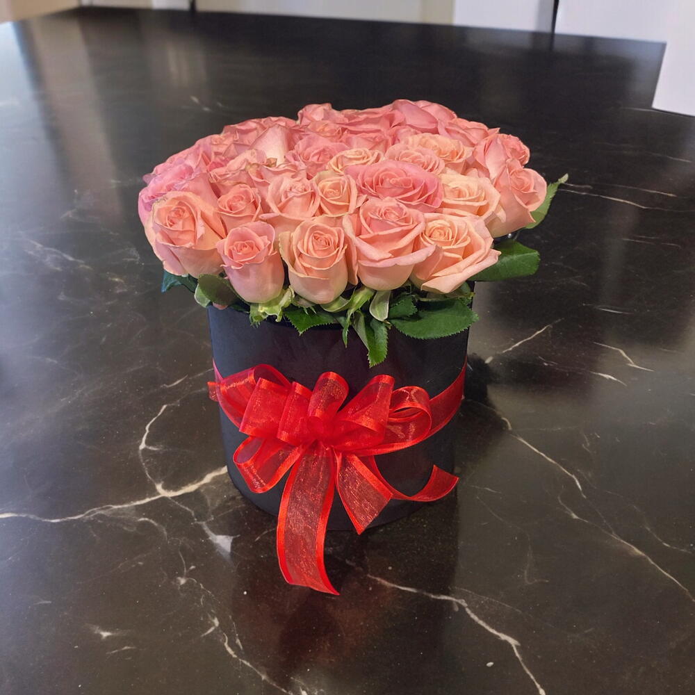 Hermoso arreglo floral, compuesto por 36 rosas hermosas en base negra y liston de organza rojo,