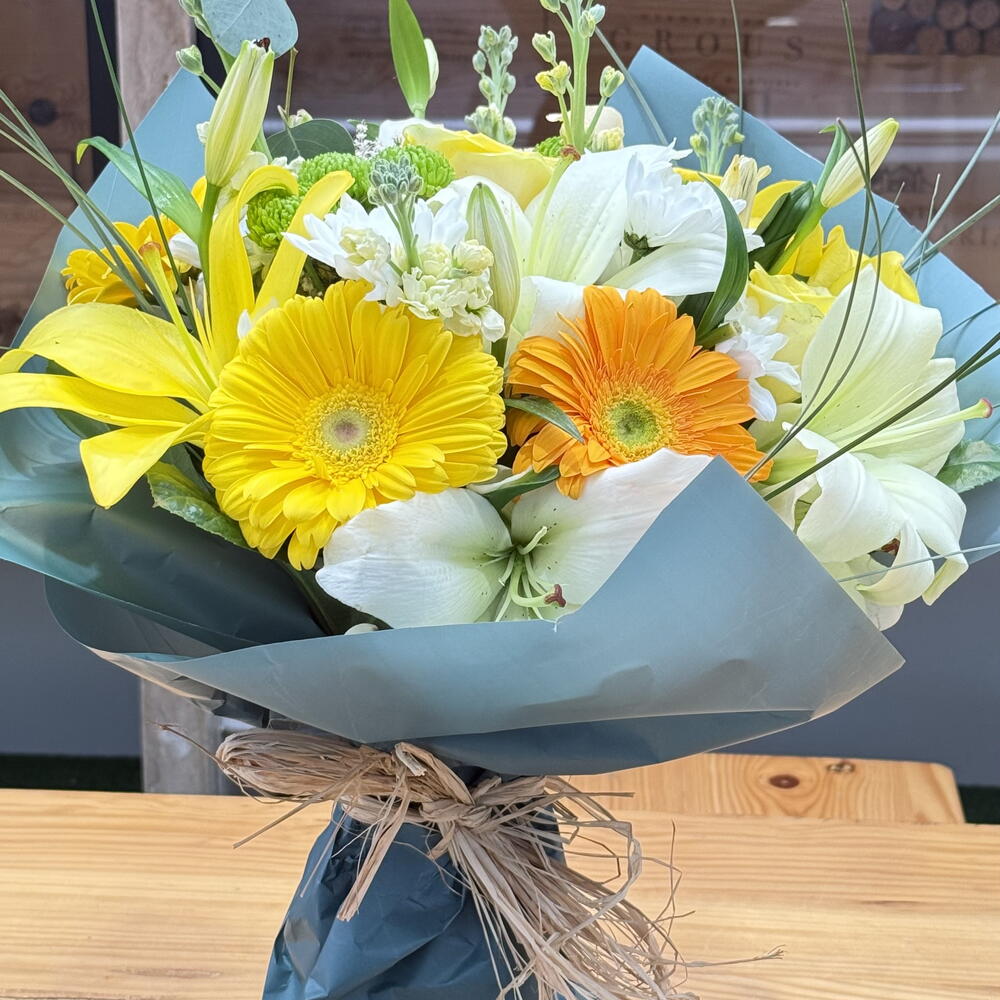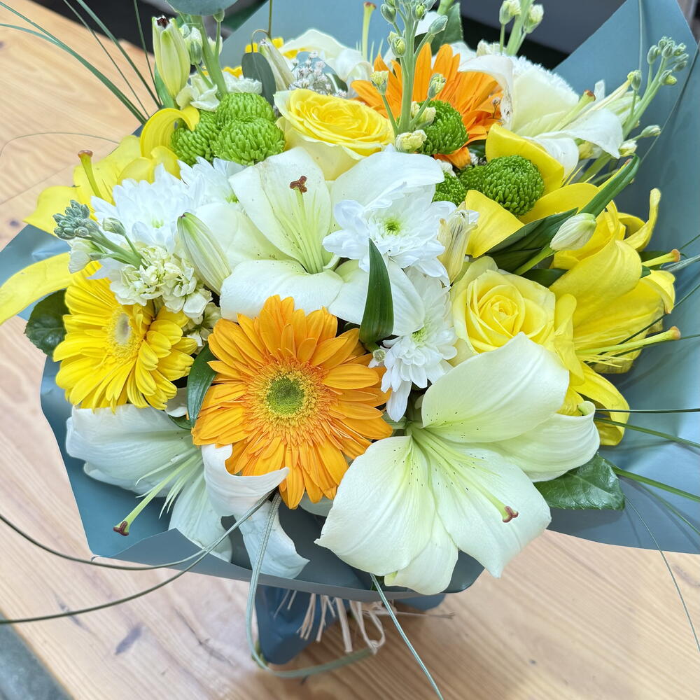 rosa amarilla - 2 pcs boca de lobo - 3 pcs margarida verde - 2 pcs lirio branco - 2 pcs lírio amarelo - 2 pcs gerbera laranja - 2 pcs gerbera amarela - 2 pcs