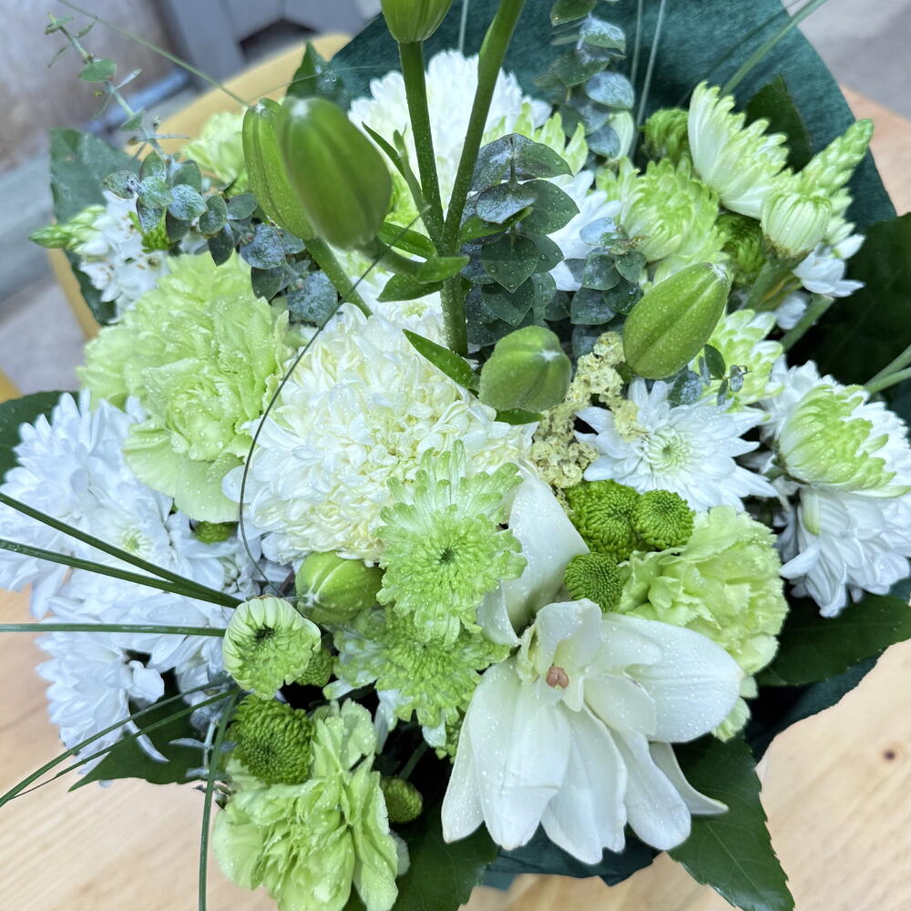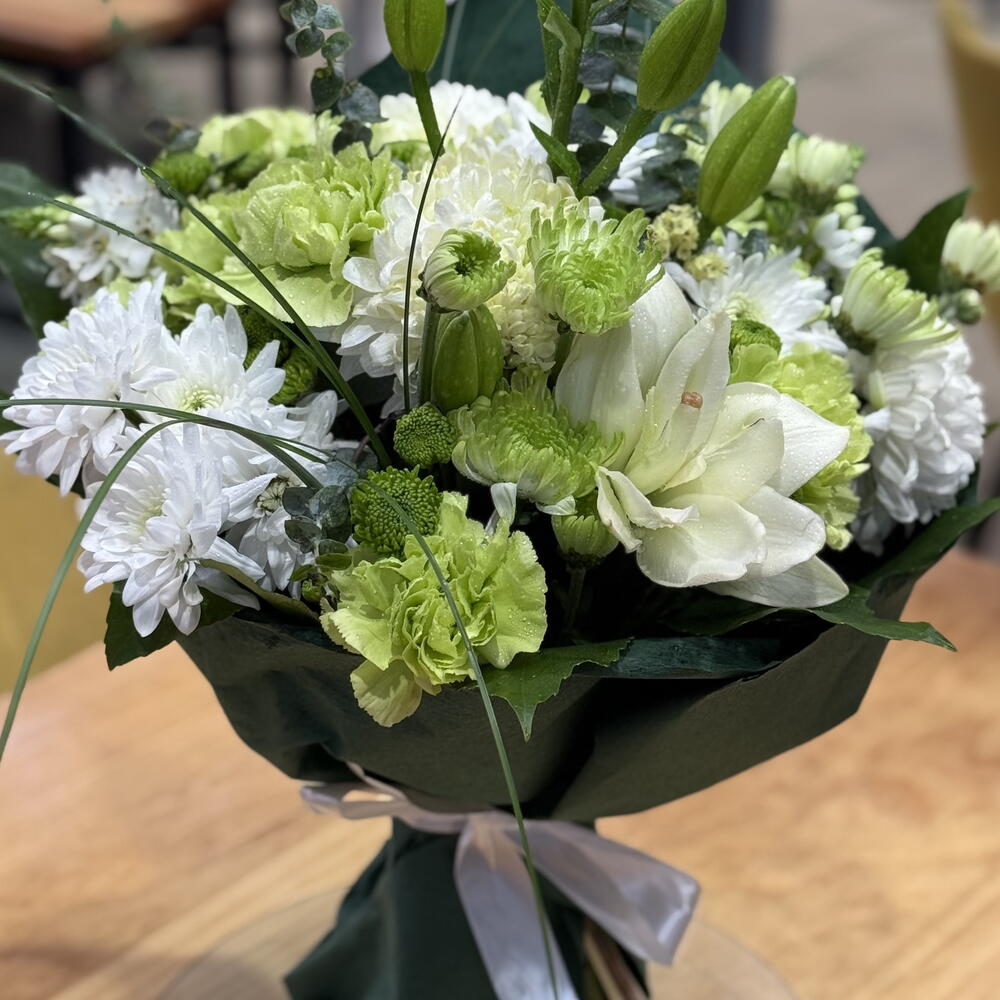 eucalyptus - 2 pcs margaritas - 6 pcs anastasia - 3 pcs lirio - 1 pcs cravos - 6 pcs