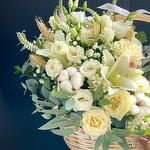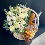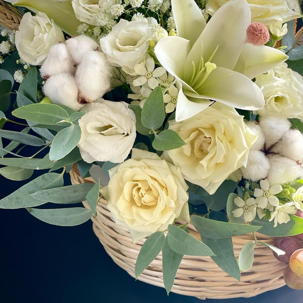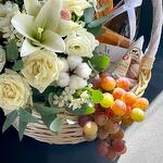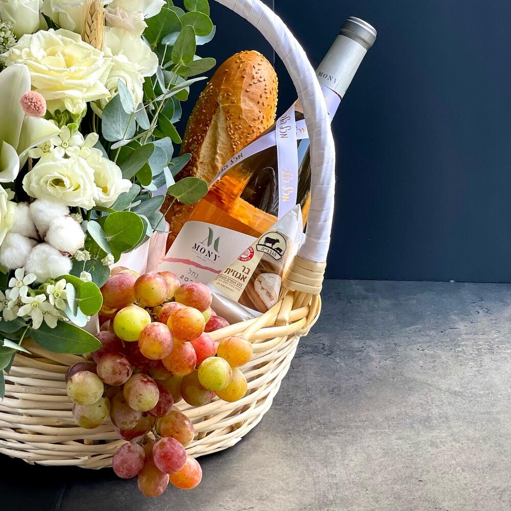 Limonium - 2 pcs Gypsophila - 1 pcs Lisianthus - 3 pcs Lilies - 3 pcs Cotton - 2 pcs rose - 3 pcs apple - 1 pcs craspedia - 1 pcs wheat (dried flowers) - 9 pcs green apple - 1 pcs sorghum - 1 pcs basket large - 1 pcs israeli rose wine “mony” - 750 ml half baget - 1 pcs green grapes - 500 g israeli cheese brie - 125 g