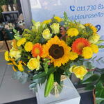 A beautiful bright flower vase arrangement in a clear vase with sunflowers, yellow roses, chrysenthemums and greenery