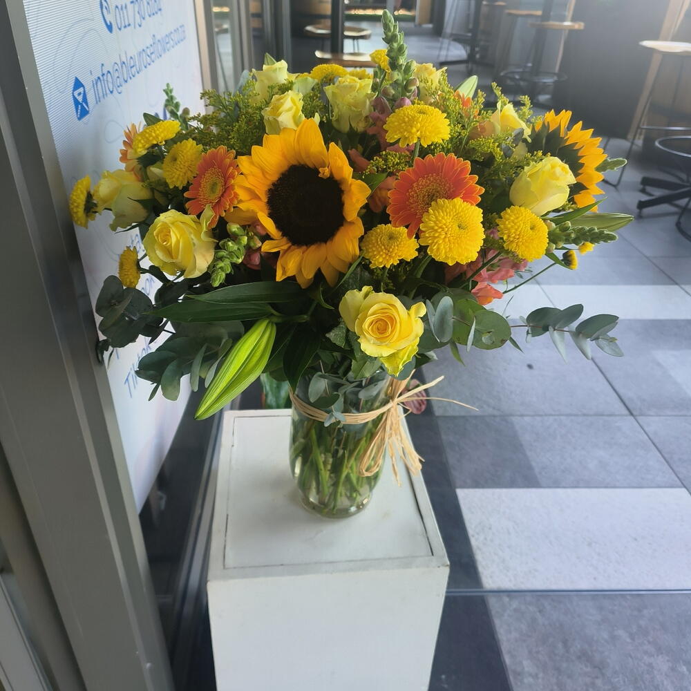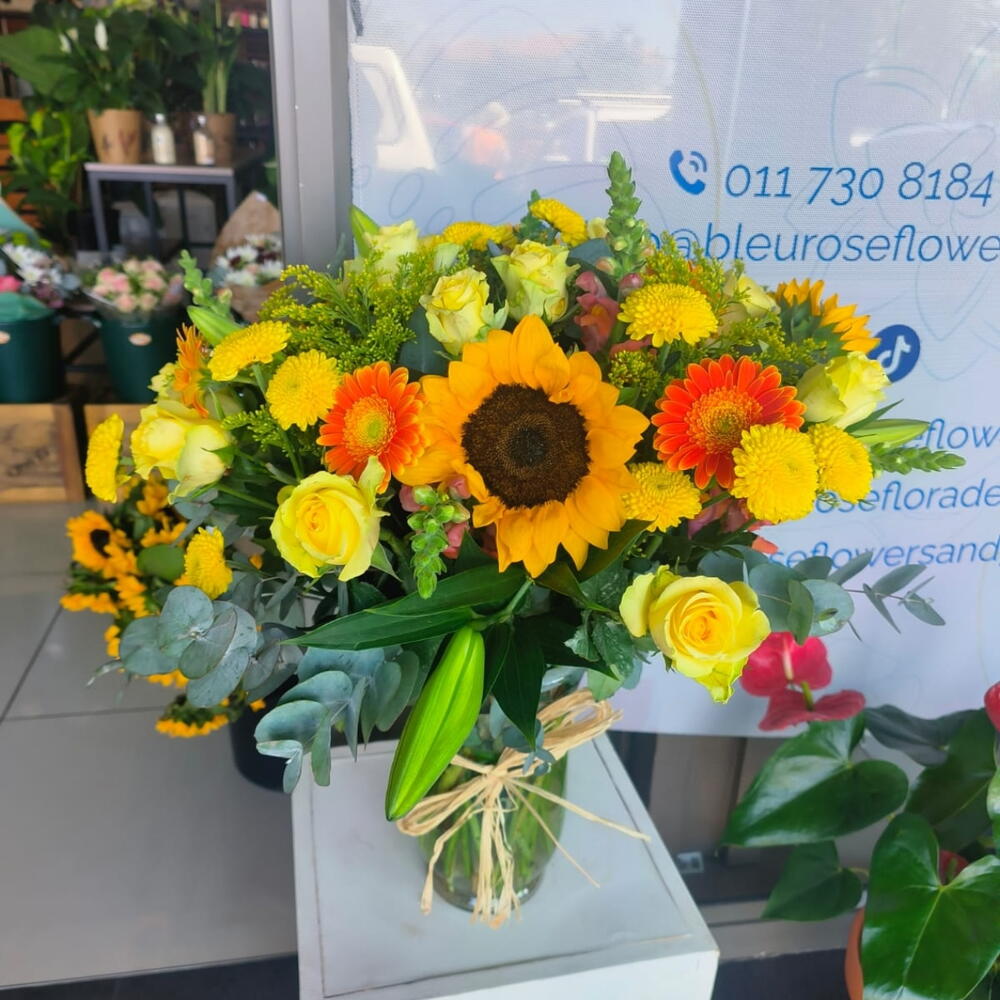 A beautiful bright flower vase arrangement in a clear vase with sunflowers, yellow roses, chrysenthemums and greenery