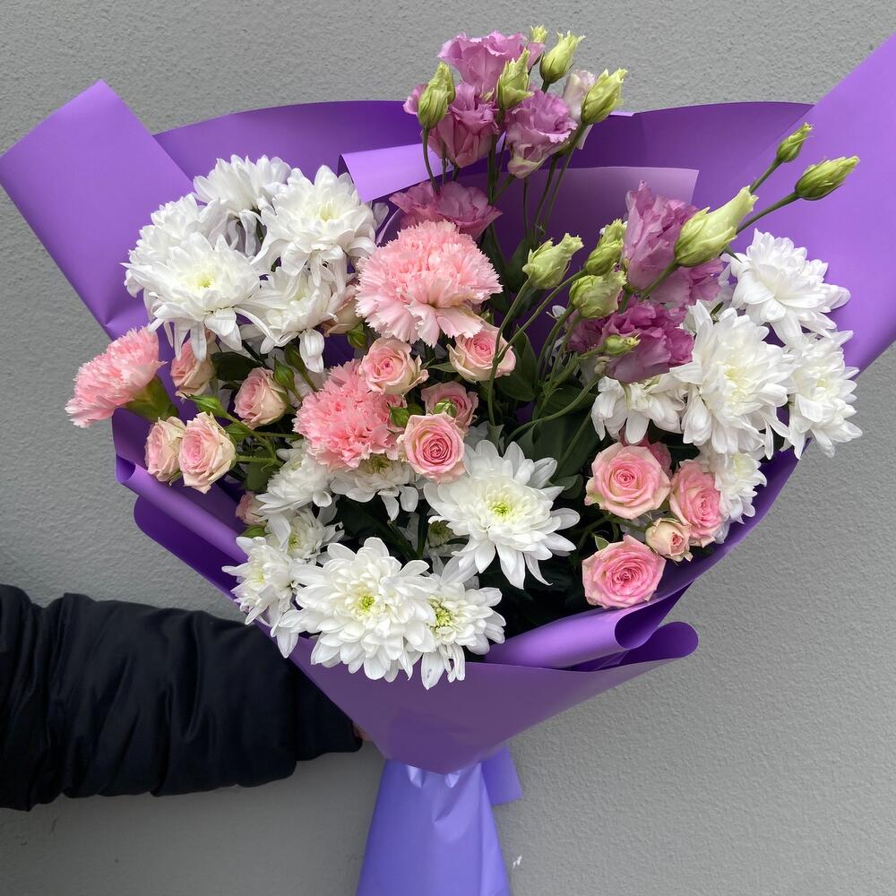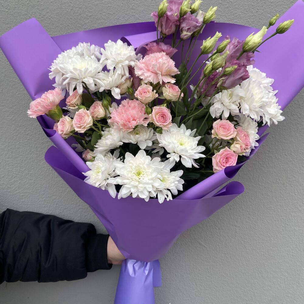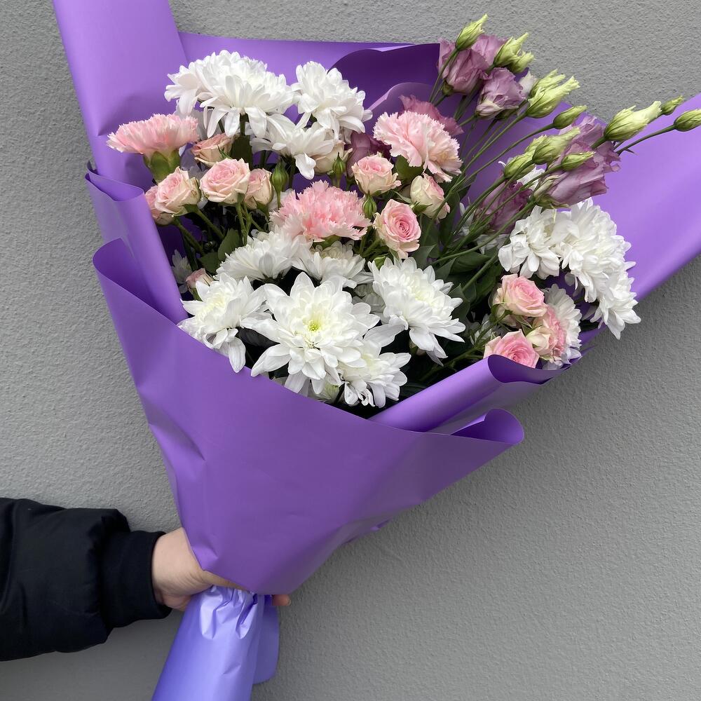 Limonium - 1 pcs dianthus - 3 pcs paber - 1 pcs kruzanteem - 3 pcs spray roses pink - 1 pcs