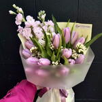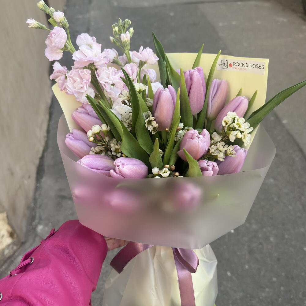 A delicate and highly fragrant spring arrangement in soothing pastel purple tones. This designer bouquet features elegant lavender tulips, tall and sweet-scented Matthiola (Stock), and cute white waxflower accents. Wrapped in premium frosted matte paper, it’s a sophisticated and charming gift for Mothers Day, birthdays, or just to bring a touch of spring indoors. Tags: Purple tulips, Lavender bouquet, Matthiola, Waxflower, Spring flowers, Mothers day, Pastel bouquet, Fragrant flowers.