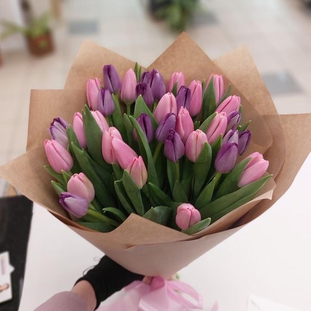 Delicate pink tulips combined with a deep shade of purple create a bouquet full of elegance and fresh, spring energy. Pink symbolizes tenderness and joy, and purple — uniqueness, class, and a hint of mystery. Together they create an effect that draws the eye and elicits a "wow" from the very first impression.