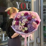 Lilac Volume Bouquet is an elegant, cloud-like composition in soft pastel tones, created to impress with both fullness and delicacy. Lush purple hydrangeas form a rich, airy base, while textured purple chrysanthemums add depth and character. Creamy and blush spray roses bring gentle romance, and tender lisianthus completes the bouquet with refined softness. This bouquet feels luxurious yet light — perfect for birthdays, anniversaries, congratulations, or simply to express care and admiration. Its harmonious lilac palette symbolizes grace, calm, and sophistication, making Lilac Volume a timeless choice for any special moment.