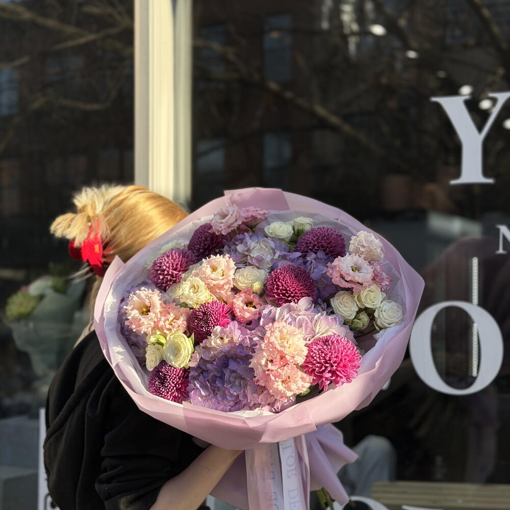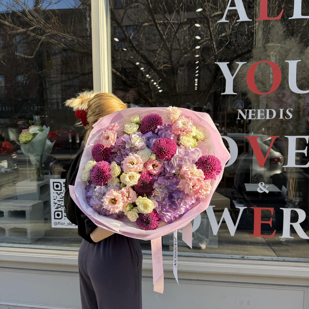 Lilac Volume Bouquet is an elegant, cloud-like composition in soft pastel tones, created to impress with both fullness and delicacy. Lush purple hydrangeas form a rich, airy base, while textured purple chrysanthemums add depth and character. Creamy and blush spray roses bring gentle romance, and tender lisianthus completes the bouquet with refined softness. This bouquet feels luxurious yet light — perfect for birthdays, anniversaries, congratulations, or simply to express care and admiration. Its harmonious lilac palette symbolizes grace, calm, and sophistication, making Lilac Volume a timeless choice for any special moment.