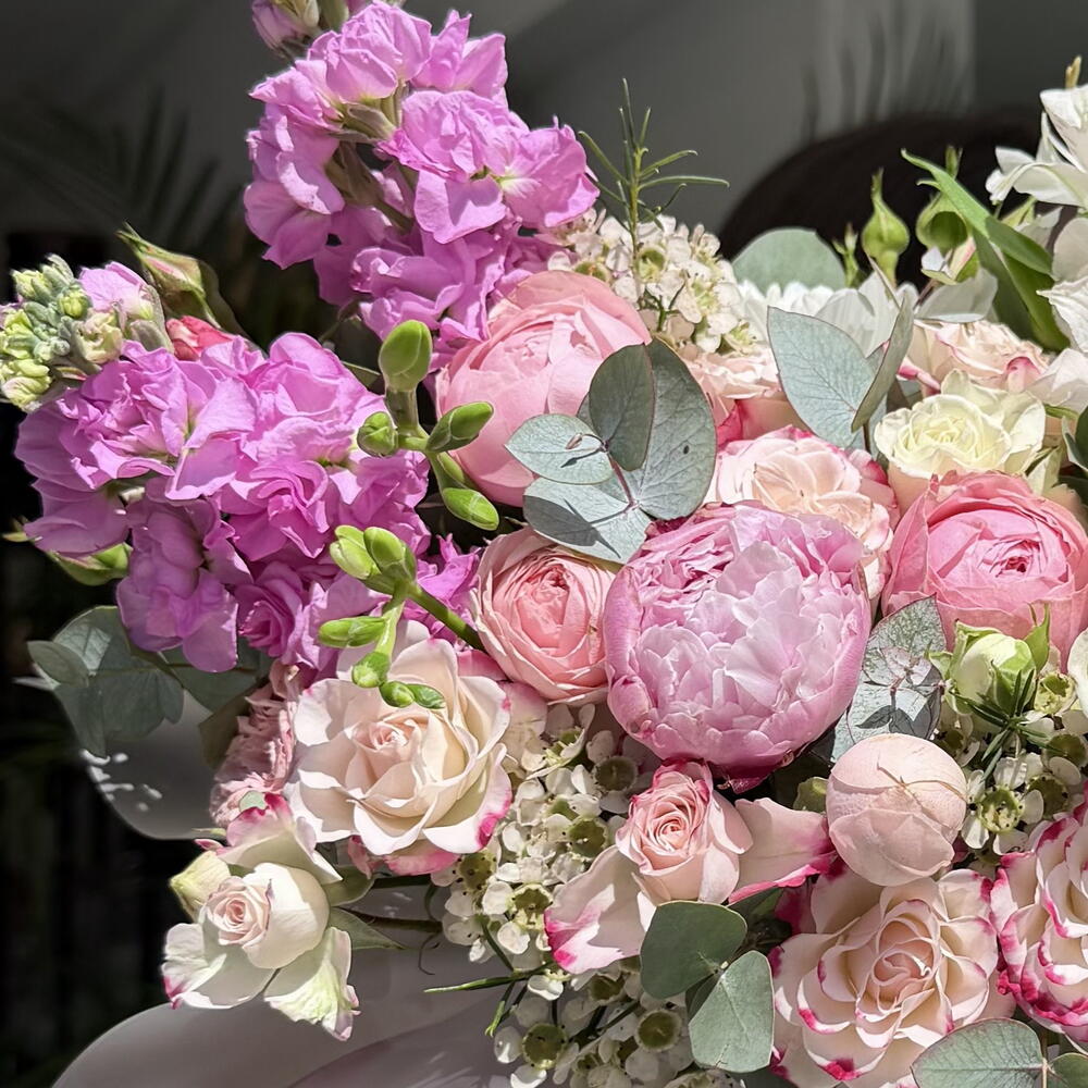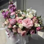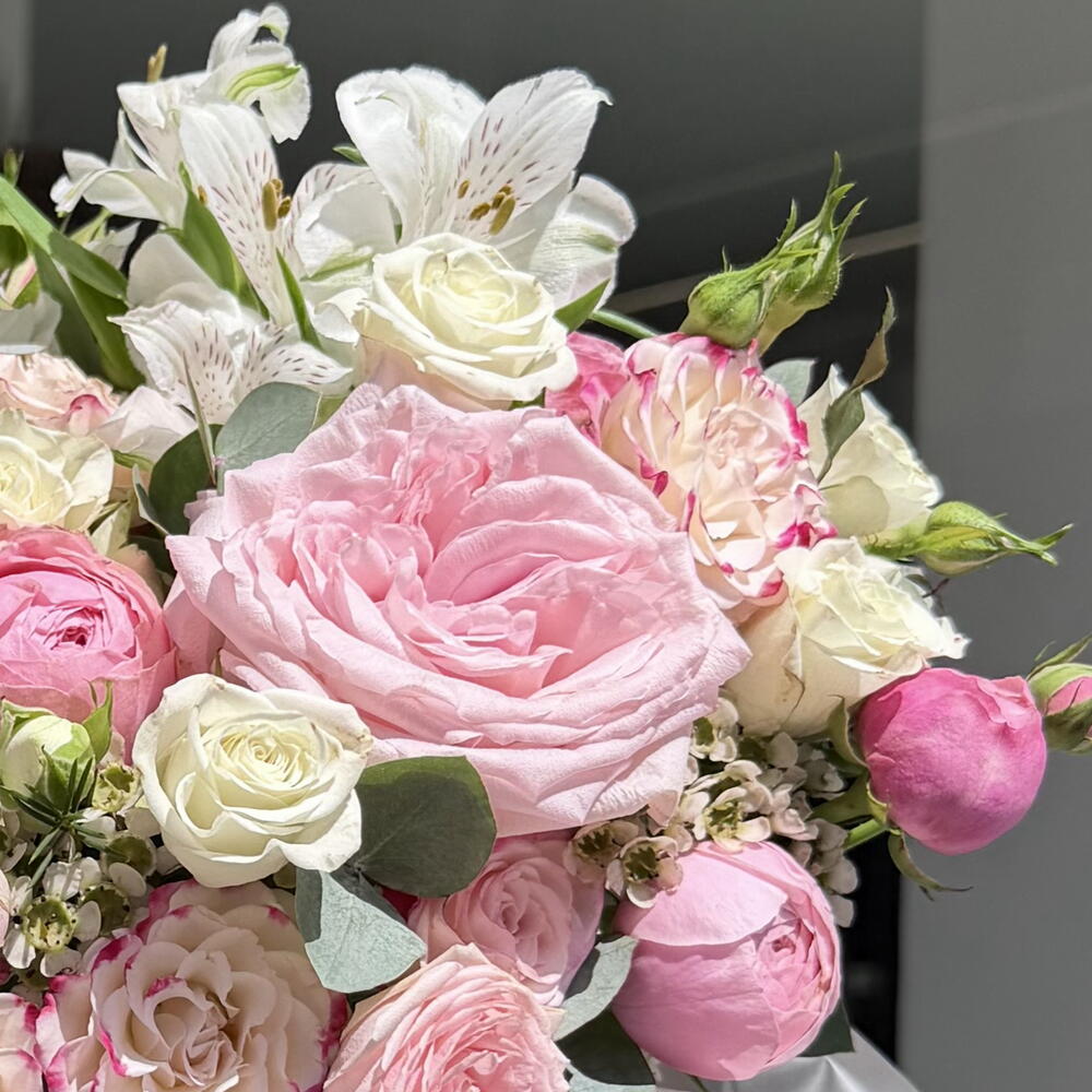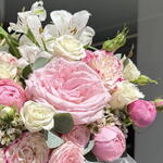 Alstroemeria - 1 pcs peonies - 1 pcs chrysanthemum - 2 pcs matthiola - 2 pcs roses - 1 pcs spray roses - 6 pcs Wax flower - 1 pcs eucalyptus - 1 pcs