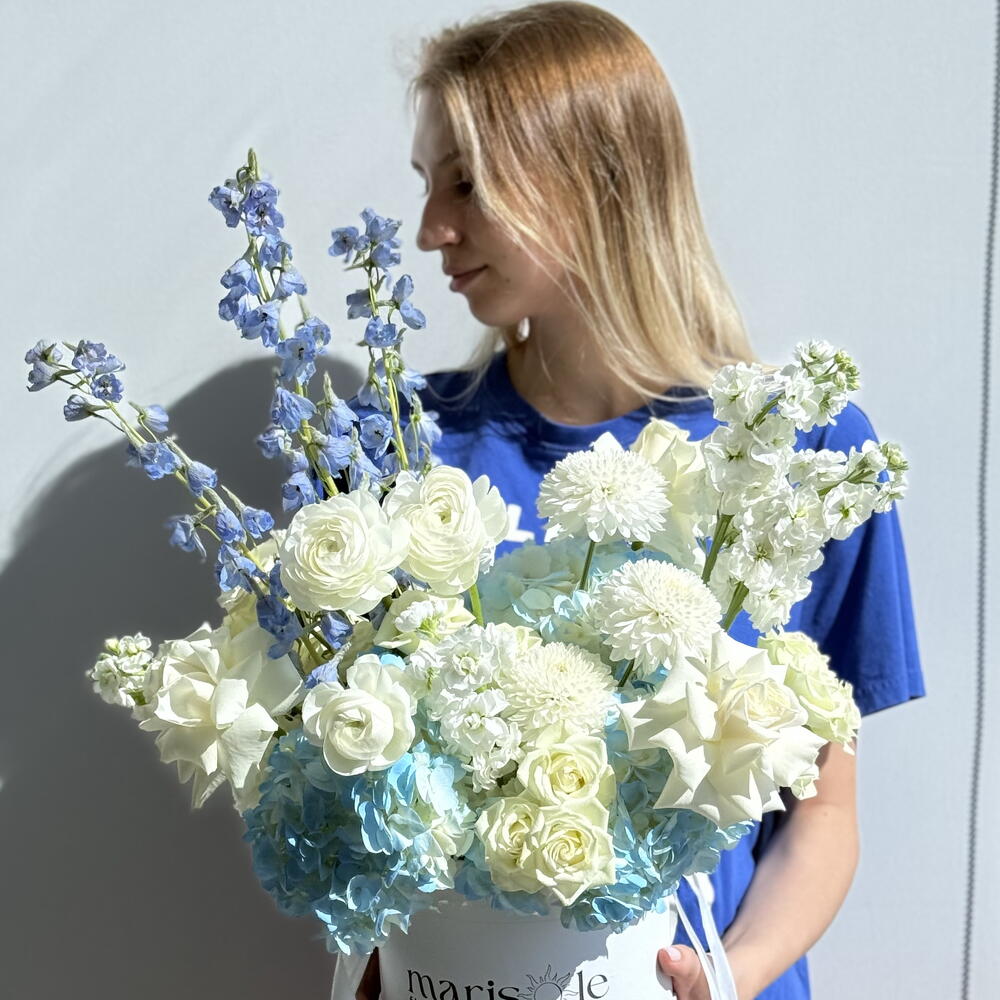 Step into a captivating aesthetic experience with our carefully curated Flowers in a Box. This divine arrangement is comprised of 4 enchanting hydrangeas, 3 tall and graceful delphiniums, 5 deeply fragrant matthiolas, 5 charming spray roses, 3 radiant chrysanthemums, 5 vibrant dianthus, 3 silky ranunculus, and 5 opulent French roses. Bathed in vivid hues and delightful aromas, this elegant composition serves as the perfect gift for any celebration, or an enchanting centerpiece that will surely breathe life into any room. Fall in love with the enchanting wonder of nature with our Flowers in a Box.