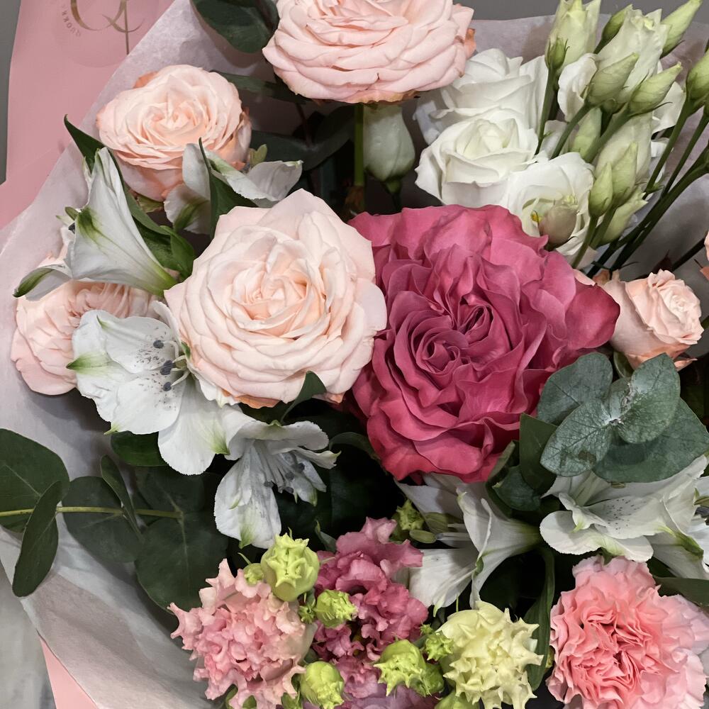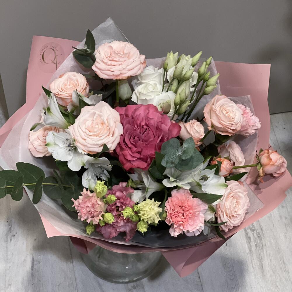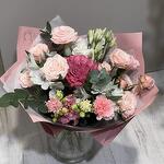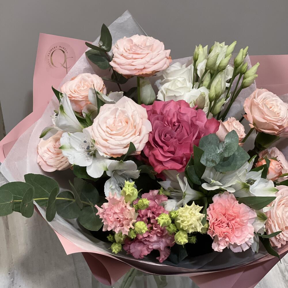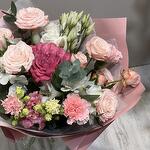 Eustoma - 2 pcs Eucalyptus - 5 pcs Spray rose - 2 pcs Alstroemeria - 2 pcs rose - 1 pcs dianthus - 2 pcs wrapping paper - 4 pcs