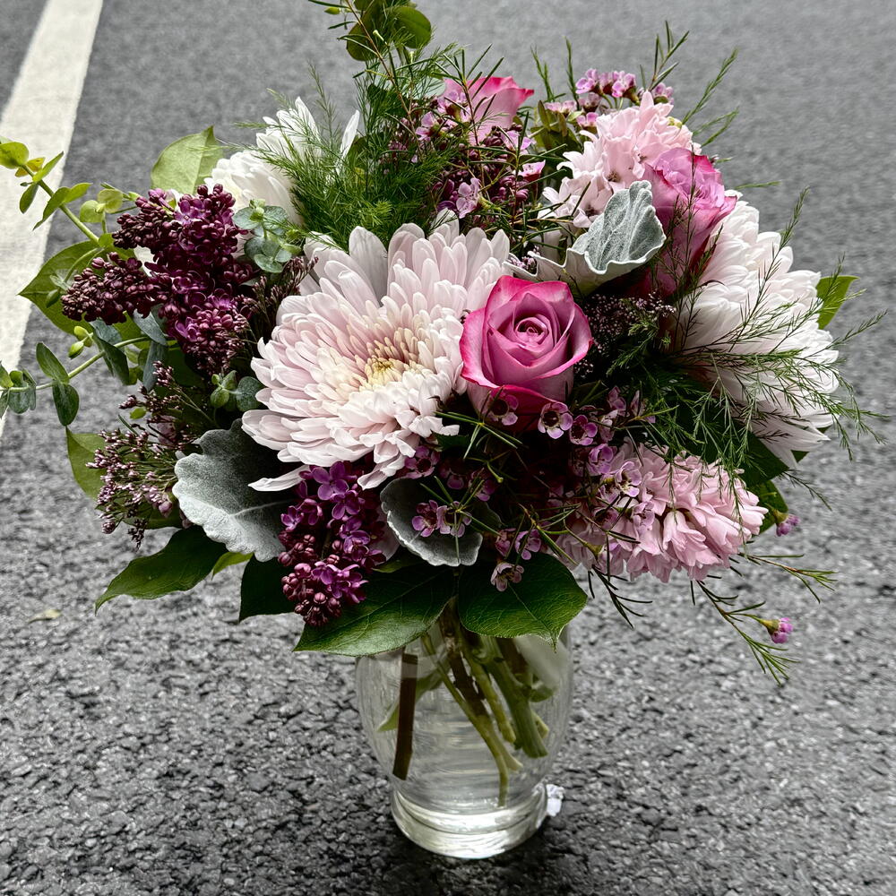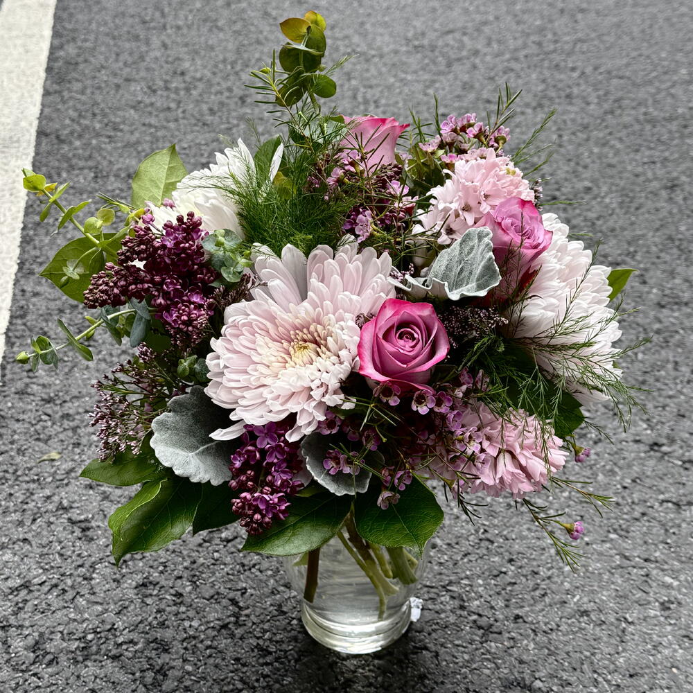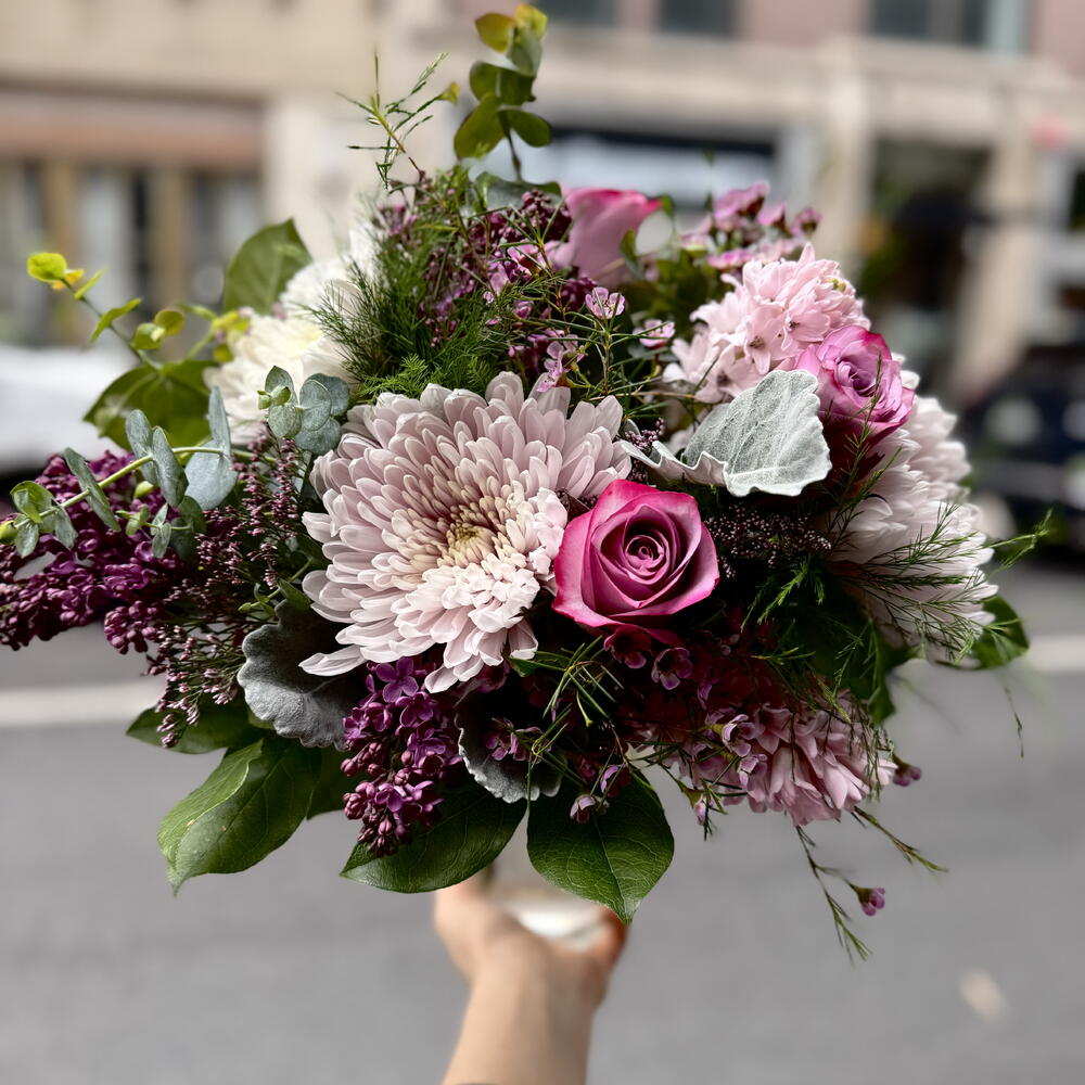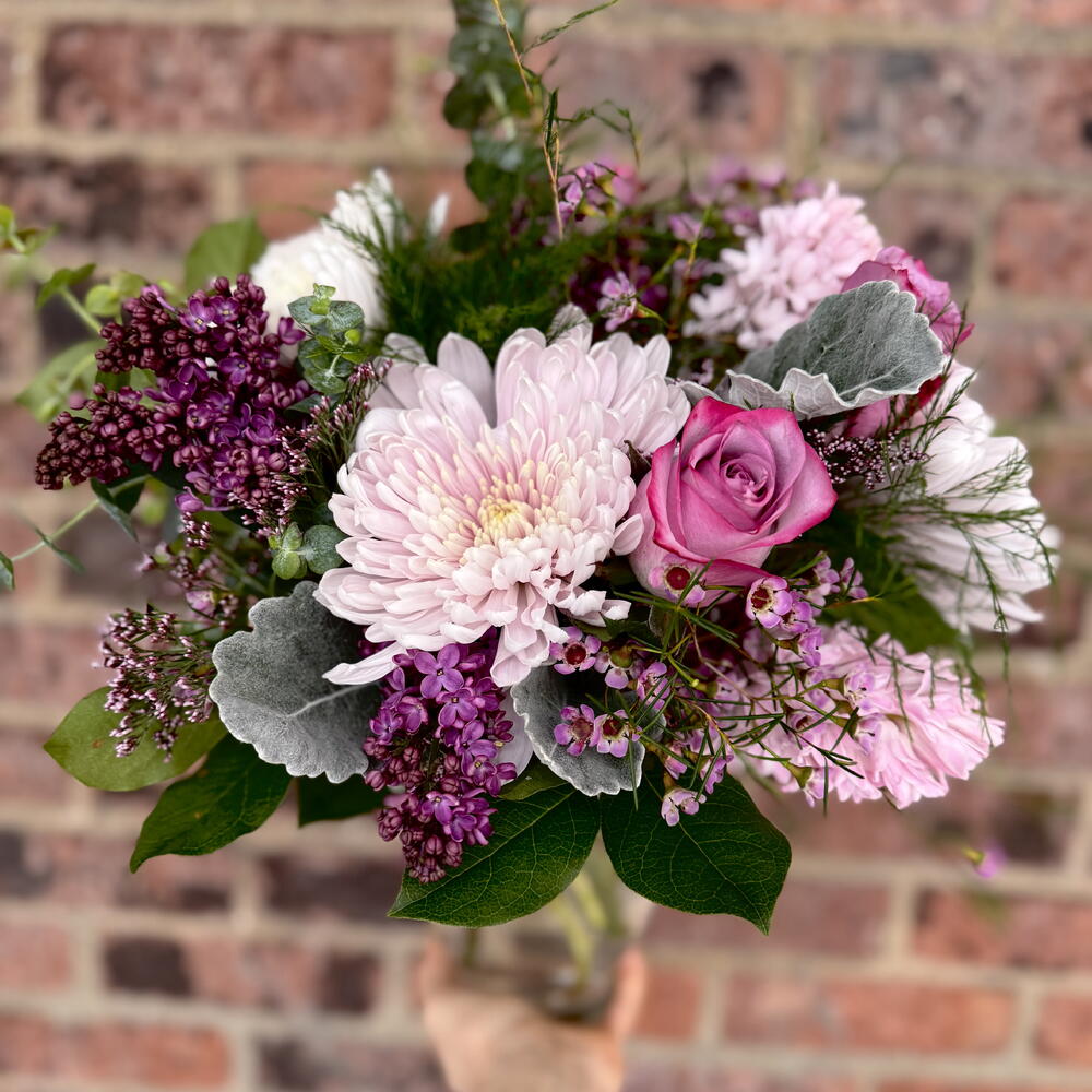 Lola is a fresh spring bouquet of lilac, roses, spider mums and hyacinth that will brighten any room. Perfect for any occasion, these blooms are hand-picked and expertly arranged by our skilled florists.