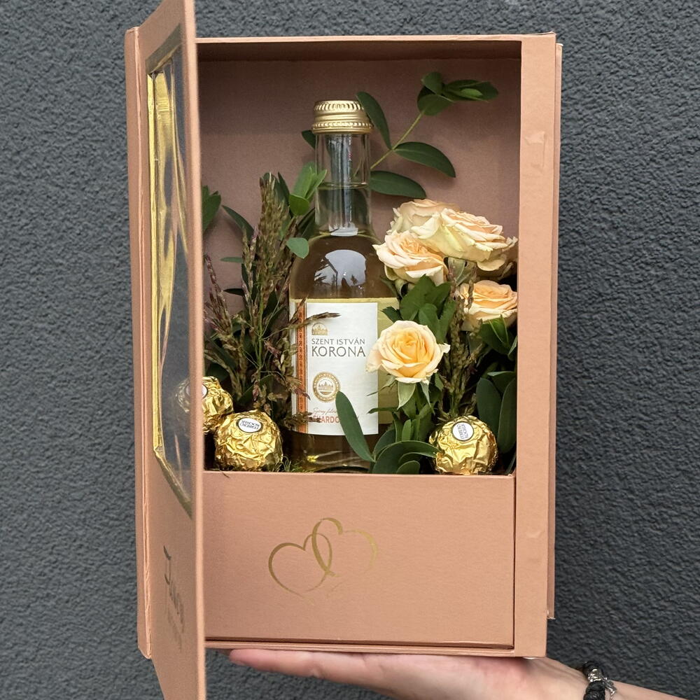 Eucalyptus - 1 pcs Spray rose - 1 pcs Box - 1 pcs Moss - 1 pcs Ferrero rocher - 3 pcs wine - 250 ml