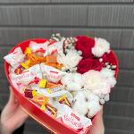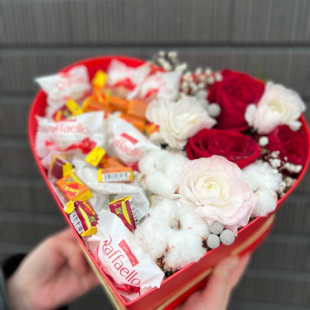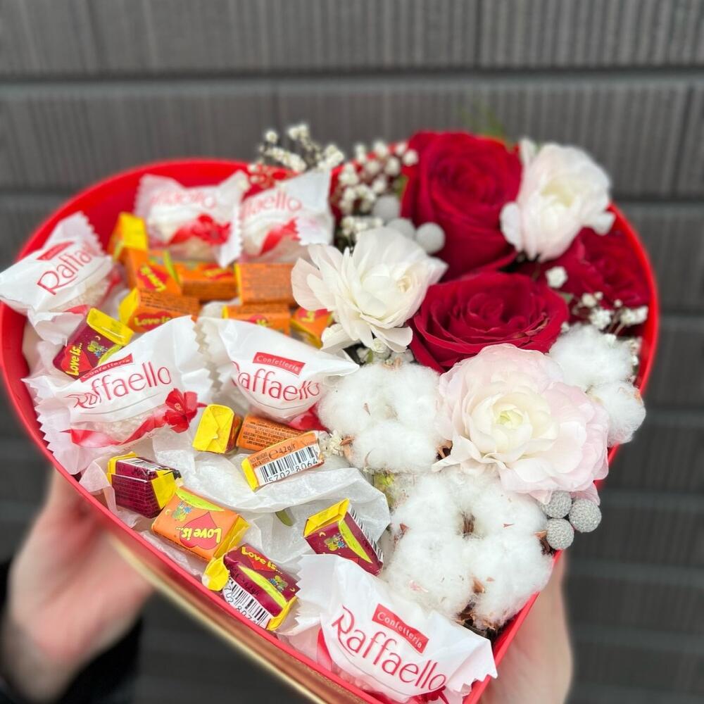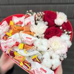 Spray rose - 3 pcs Raffaello - 6 pcs Cotton - 3 pcs love is - 16 pcs red roses - 3 pcs