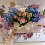 bow - 1 pcs blue hydrangeas - 4 pcs pink spray roses stems - 10 pcs envelope style box - 1 pcs
