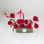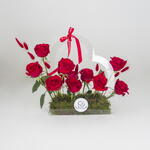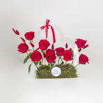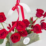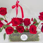 A stunning arrangement of red roses nestled in a heart-shaped acrylic box, creating a truly unforgettable expression of love.