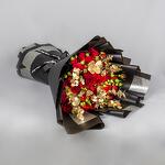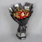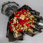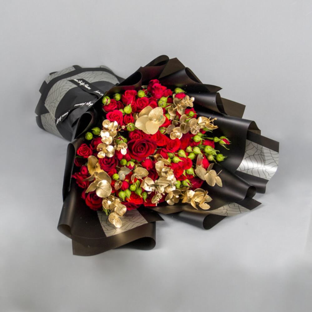 A bouquet with red Spray Roses and gold Eucalyptus with black wrapping paper.