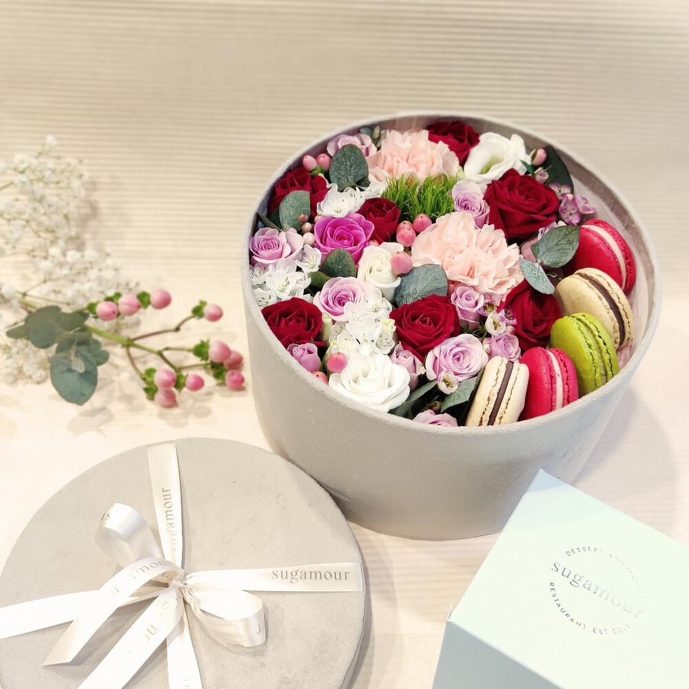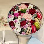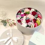 Macaron Flower Box is the best way to please your friends, colleagues, or loved ones! The box includes fresh flowers and 5 french macarons. Flavors vary according to the season, and may include: Chocolate, Salted Caramel, Vanilla, Pistachio, Raspberry Rose, and Passion Fruit Vanilla. All flowers are unique, that’s why the photo is of an informational nature. The color, size, and form of the flower that you see in the photo may vary.