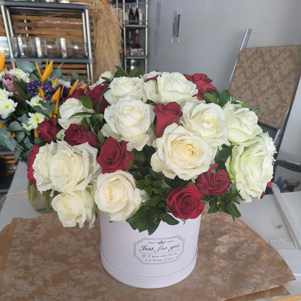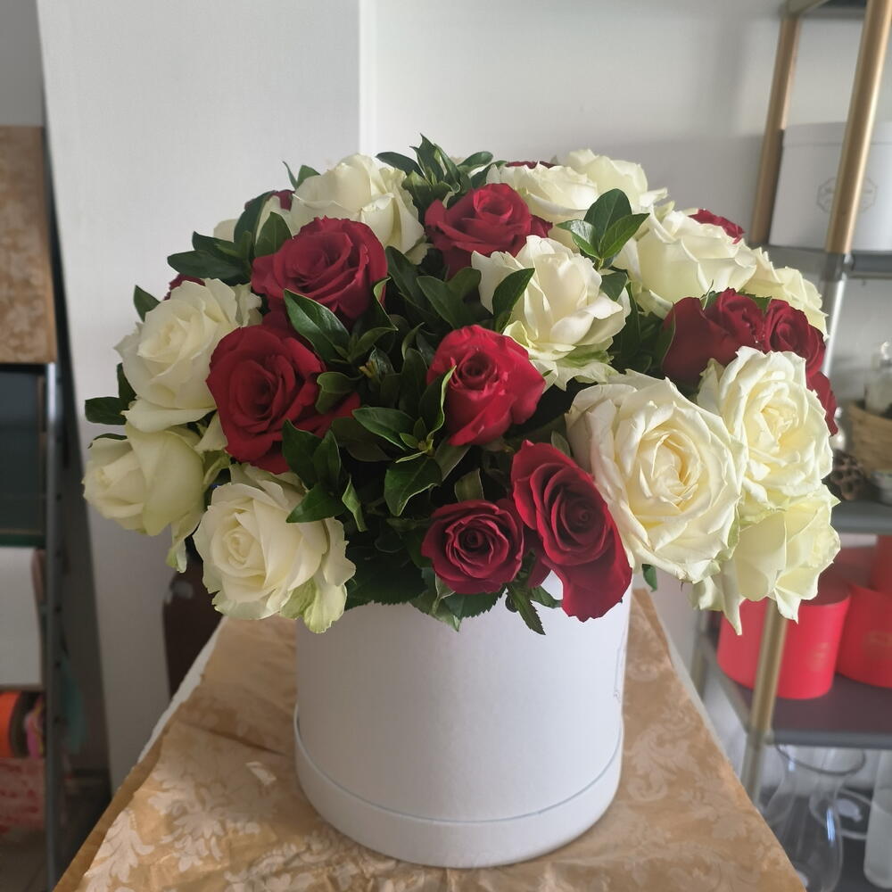 Ruscus - 10 pcs white roses. - 18 pcs red roses - 18 pcs red and white rose in a white box - 400 g white large box - 1 pcs
