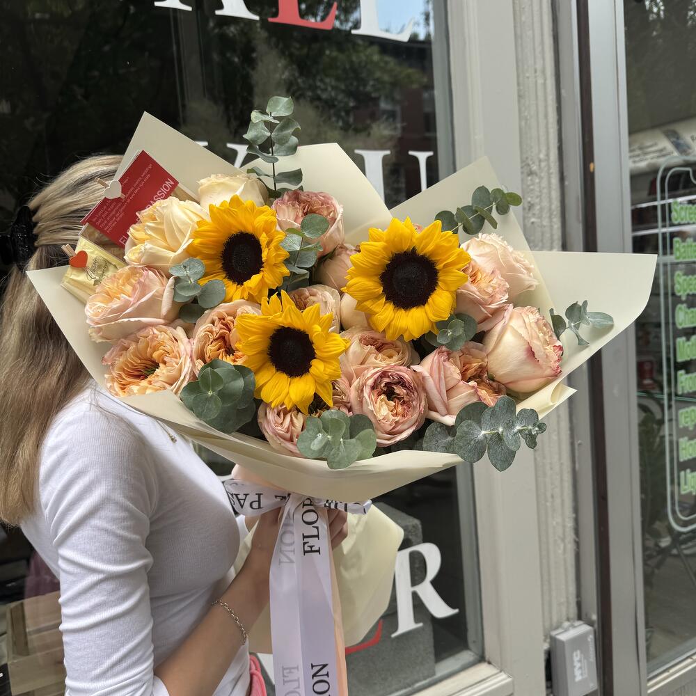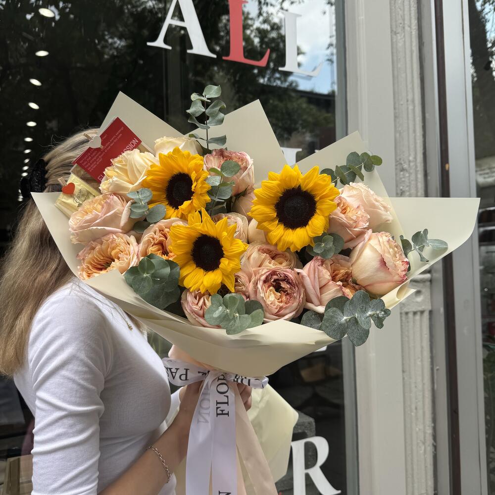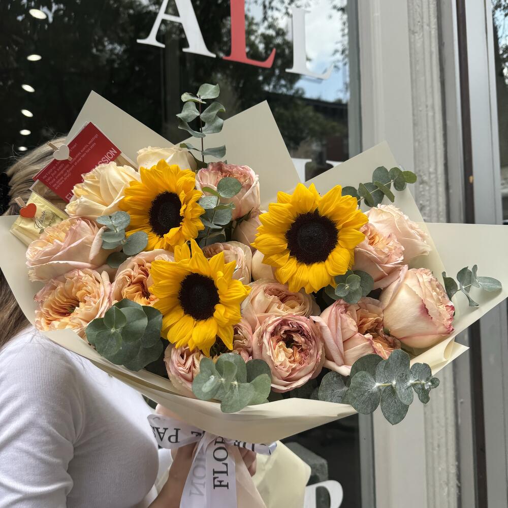 Expertly crafted with a delicate balance of cream expression peony garden roses, vibrant sunflowers and fragrant eucalyptus, the Loving Embrace bouquet creates a stunning display of love and affection. Each flower carefully selected for its unique beauty, this bouquet is the perfect way to express your heartfelt emotions. HOW TO CARE OF FLOWERS? Do not remove the wrapping paper from the bouquet, so then flowers will live longer Change the cold water in a vase every day Keep the vase clean Cut the stem of each flower every two days Keep the bouquet out of a direct sun, drafts and heaters Add the flower food 2-3 days after you’ve bought your bouquet (We add the flower food to every bouquet) FLOR DE PASSION TEAM