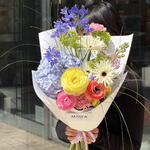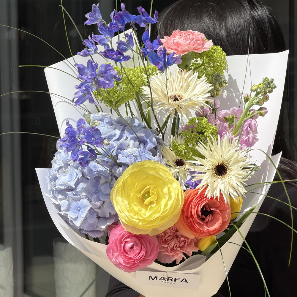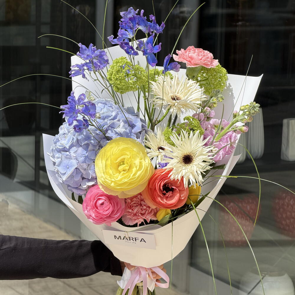 Tulips - 2 pcs Viburnum - 1 pcs dianthus - 2 pcs ranunculus - 3 pcs matthiola - 2 pcs delphinium - 1 pcs gortensia - 1 pcs sprout - 3 pcs bergrass - 1 pcs
