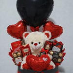 ferrero rocher chocolate box - 6 pcs medium plush love teddy - 1 pcs heart gift box black - 1 pcs heart balloon large black - 1 pcs heart balloon small red - 2 pcs plush red heart medium - 1 pcs plush red heart small - 2 pcs