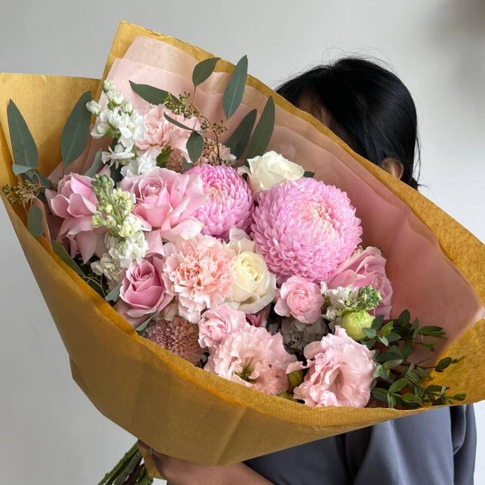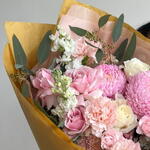 Aster - 1 pcs Lisianthus - 5 pcs carnation - 4 pcs roses - 3 pcs peony mom - 2 pcs eucalyptus - 3 pcs