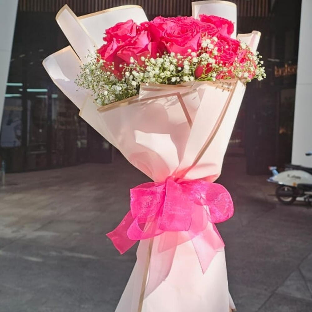 Ribbon - 1 pcs wrapping paper - 2 pcs gypsophilia white - 1 pcs pink roses bouquet - 20 pcs