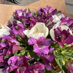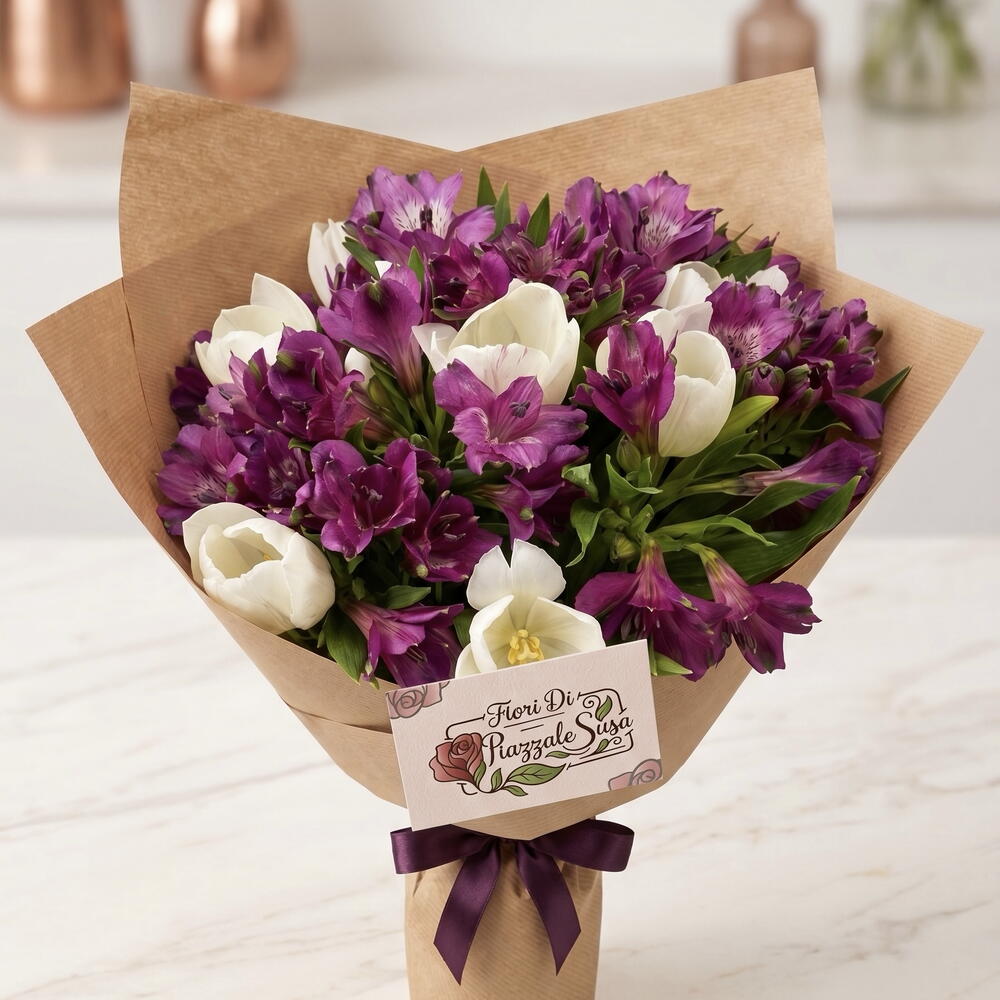 A unique creation with white tulips and Alstromeria wrapped in environment friendly brown paper.