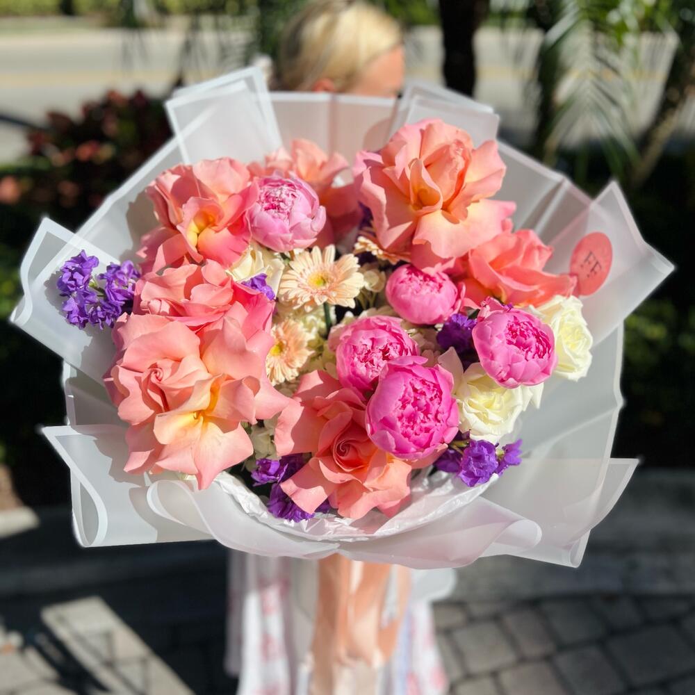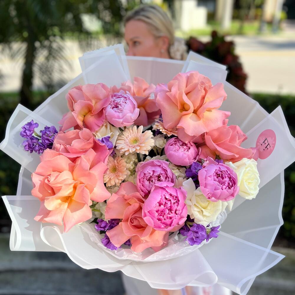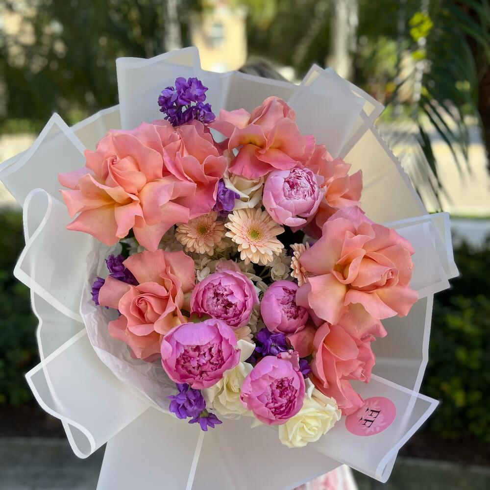Hydrangea - 3 pcs Matthiola - 10 pcs Peony - 5 pcs Rose - 15 pcs Gerbera - 5 pcs