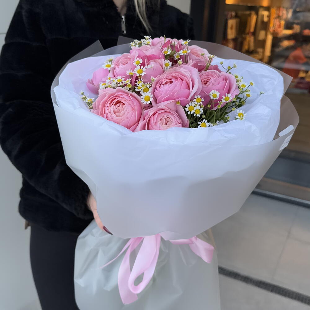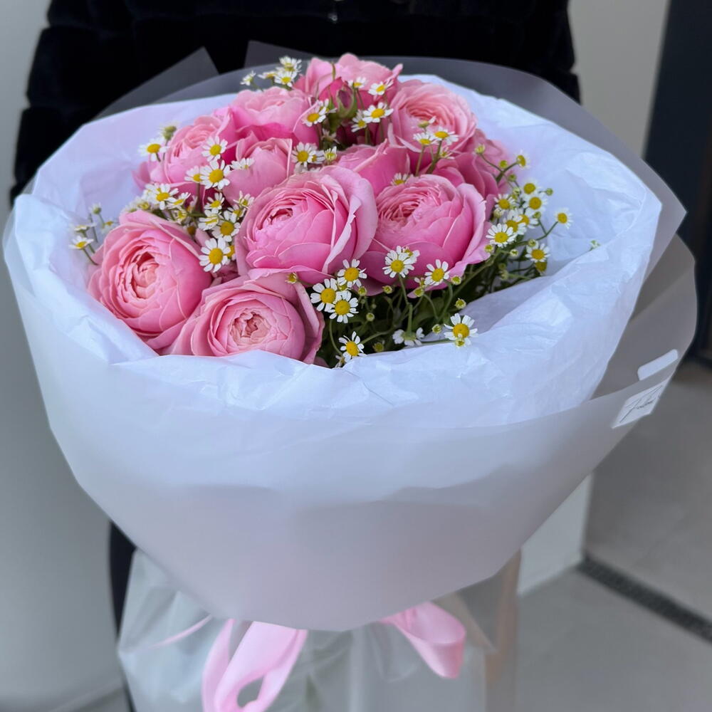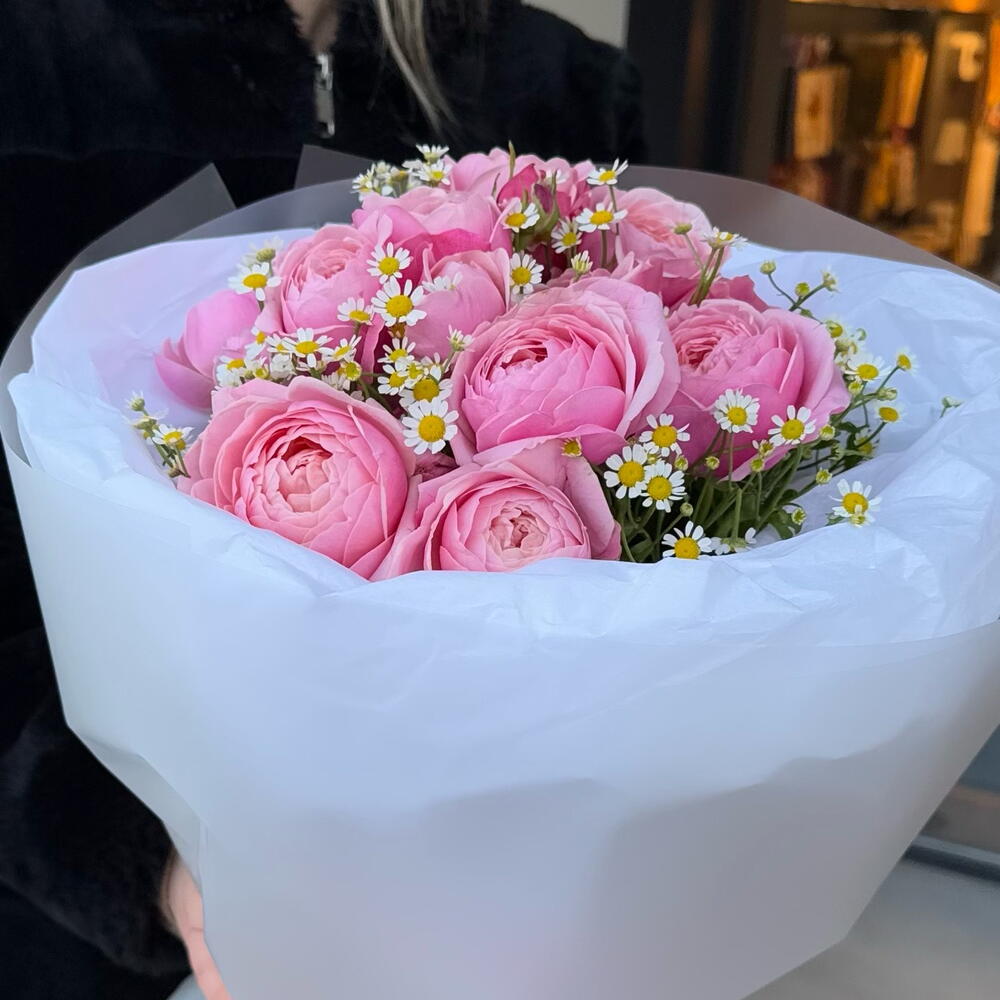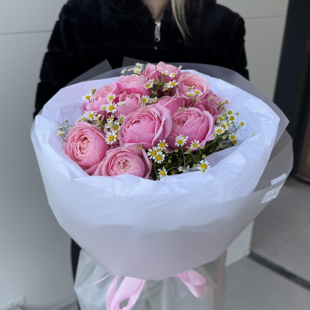 Tanacetum - 3 pcs Satin ribbon - 1 pcs Silence - 2 pcs Designer packaging - 2 pcs silva pink bush rose - 5 pcs