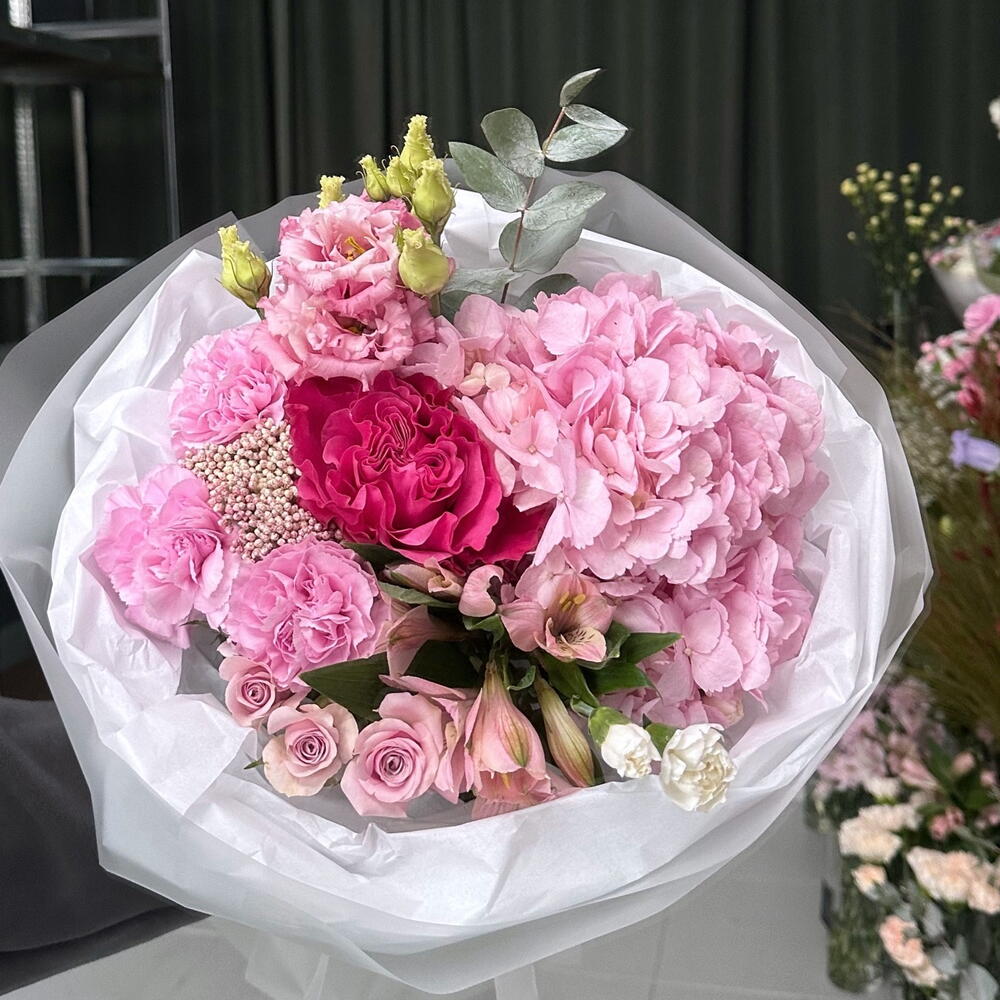 Eustoma - 1 pcs Eucalyptus - 1 pcs Alstroemeria - 1 pcs rose - 1 pcs hydrangea - 1 pcs ozothamnus - 1 pcs spray rose - 1 pcs carnation - 3 pcs spray carnation - 1 pcs