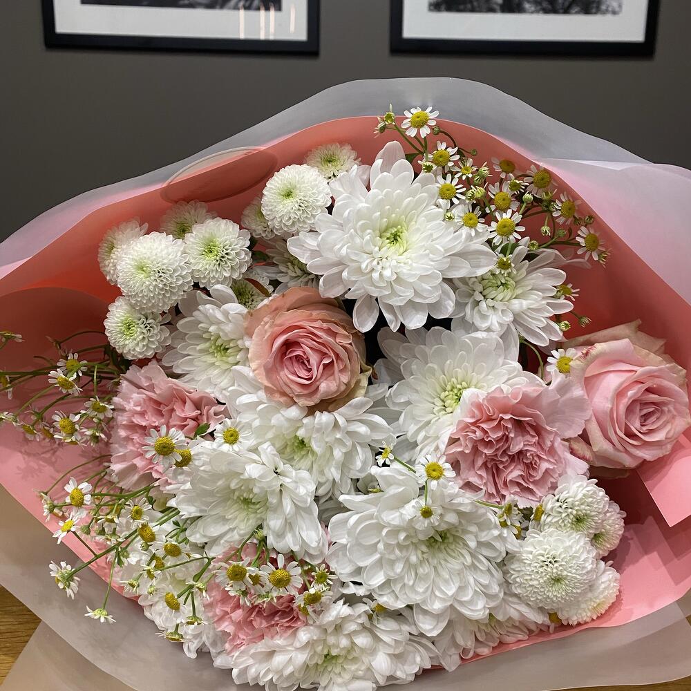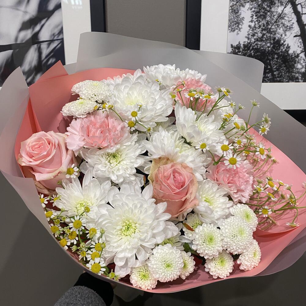 rose - 2 pcs dianthus - 3 pcs camomile - 3 pcs krizantem - 4 pcs